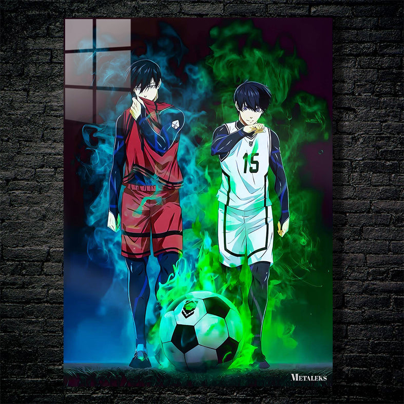 The image features Isagi Yoichi and Nagi Seishiro from “Blue Lock”. Isagi is on the left, wearing a red and black uniform, while Nagi is on the right, wearing a white uniform with the number 15. A soccer ball sits between them, and the characters are surrounded by blue and green smoke.