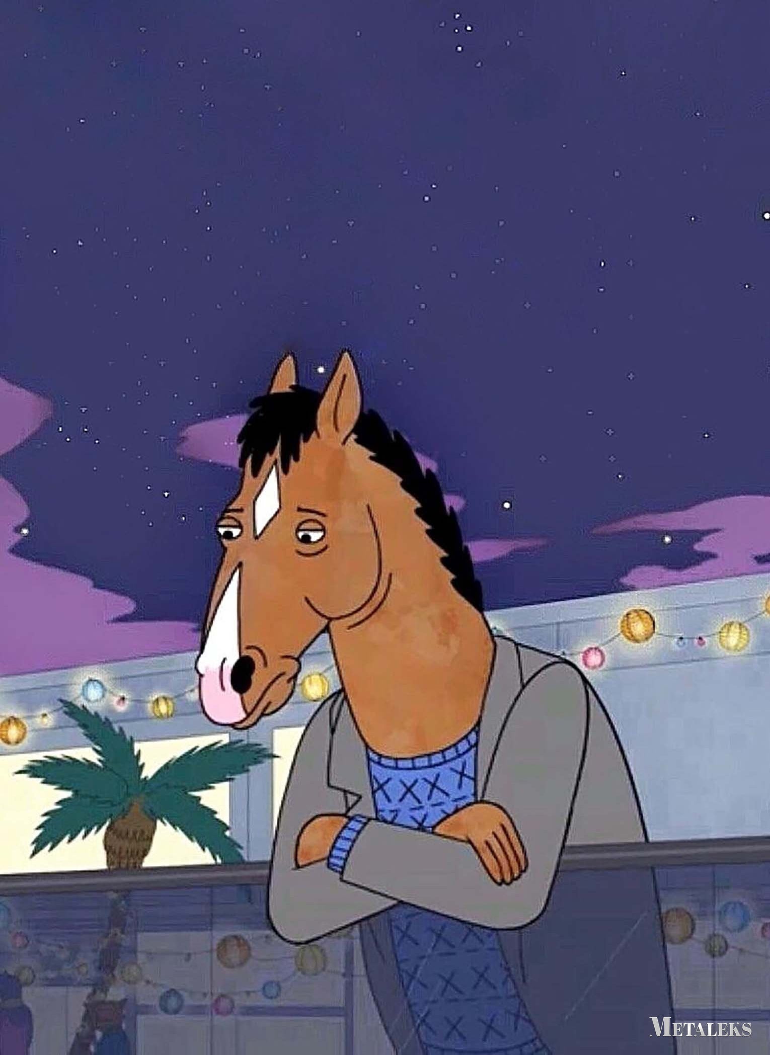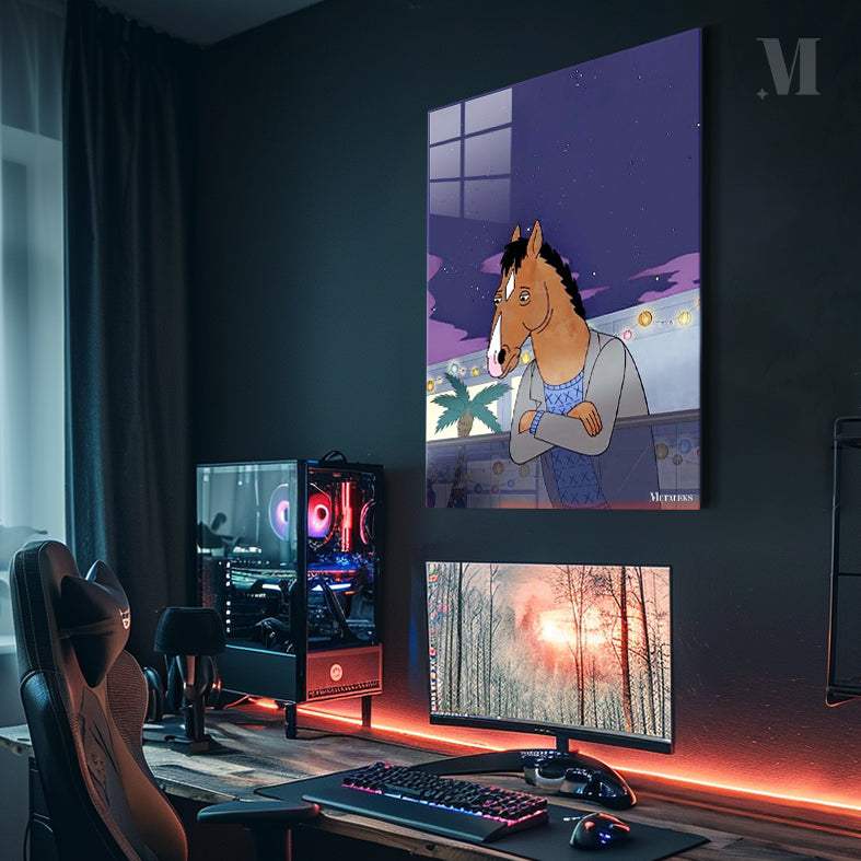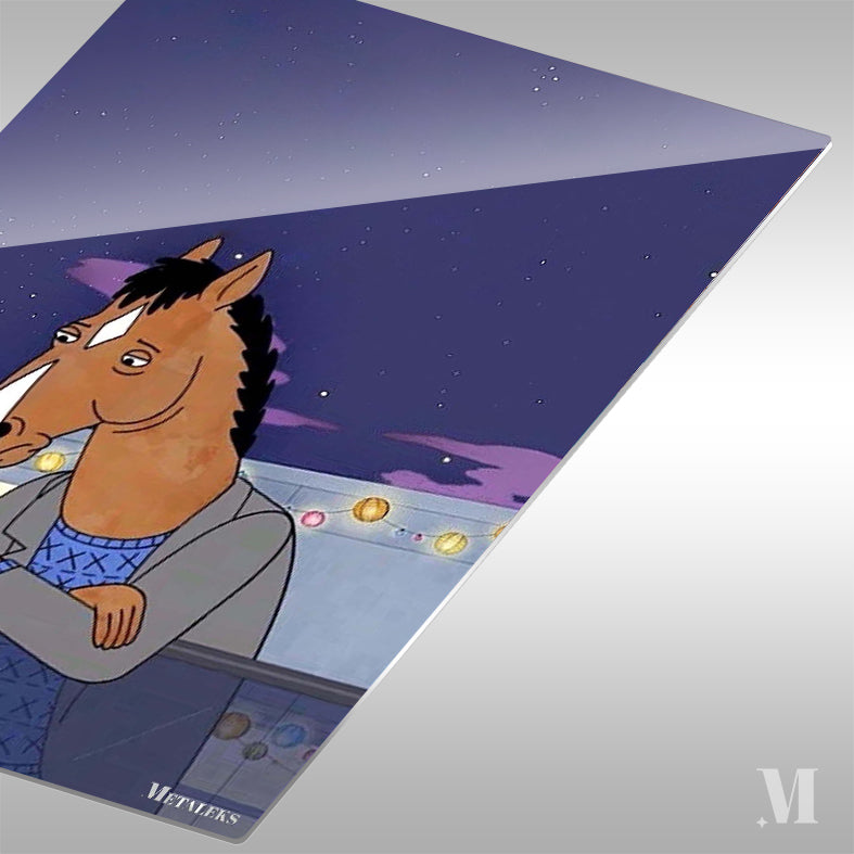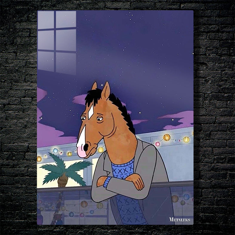 The animated character BoJack Horseman, from the series “BoJack Horseman,” is depicted with his arms crossed, wearing a gray jacket over a blue sweater with a geometric pattern. He has a horse’s head with a brown coat, black mane, and a white stripe on his face. The scene is set at night with a starry sky. Metaleks Ultra HD Metal Poster – Create Your Passionate Space.