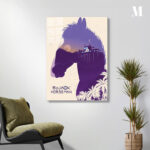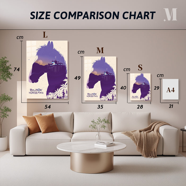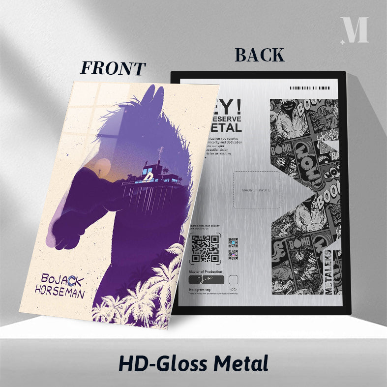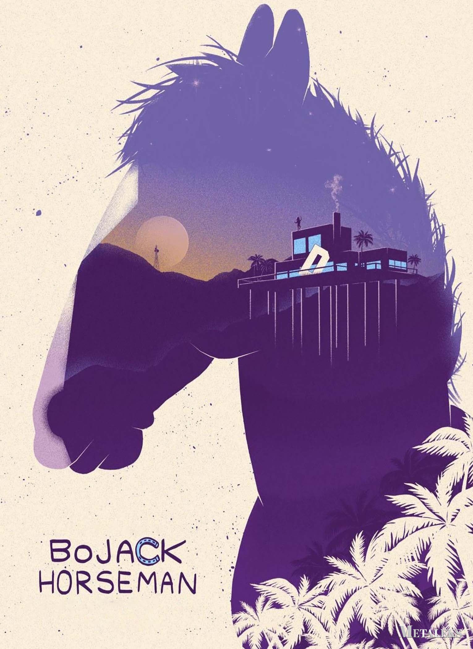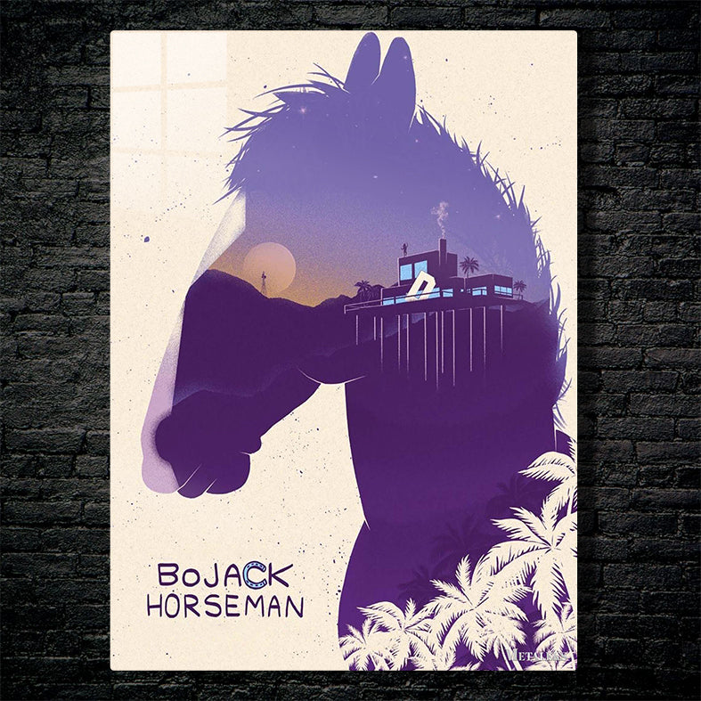The image features a stylized silhouette of a horse’s head, which is the main character Bojack Horseman from the animated series “Bojack Horseman.” The silhouette is filled with a scenic view of a sunset, a house on stilts with palm trees, and a person standing on the house. The text “Bojack Horseman” is prominently displayed at the bottom left corner. Metaleks Ultra HD Metal Poster – Create Your Passionate Space.