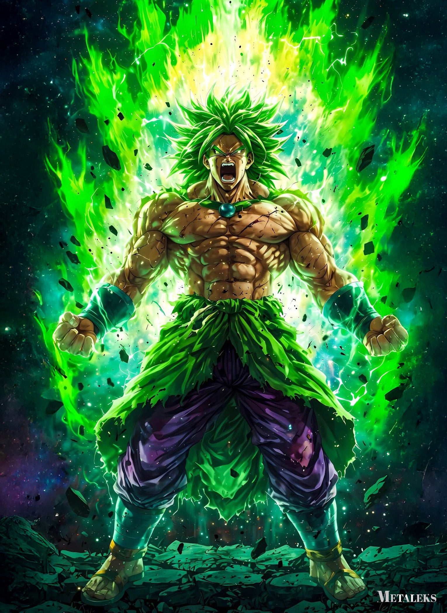 Broly from Dragon Ball is standing with a furious expression, engulfed in a vibrant green aura.