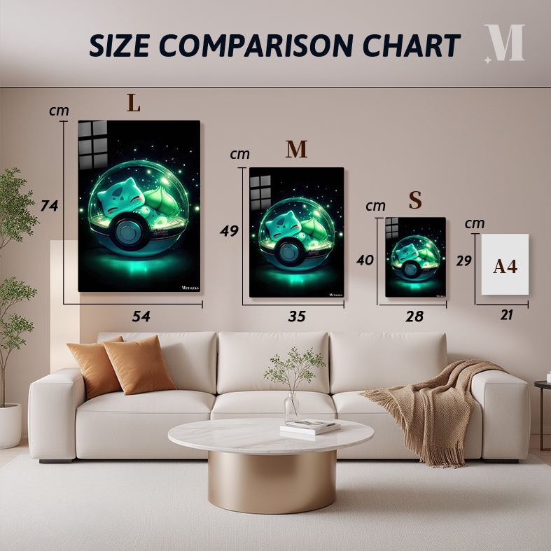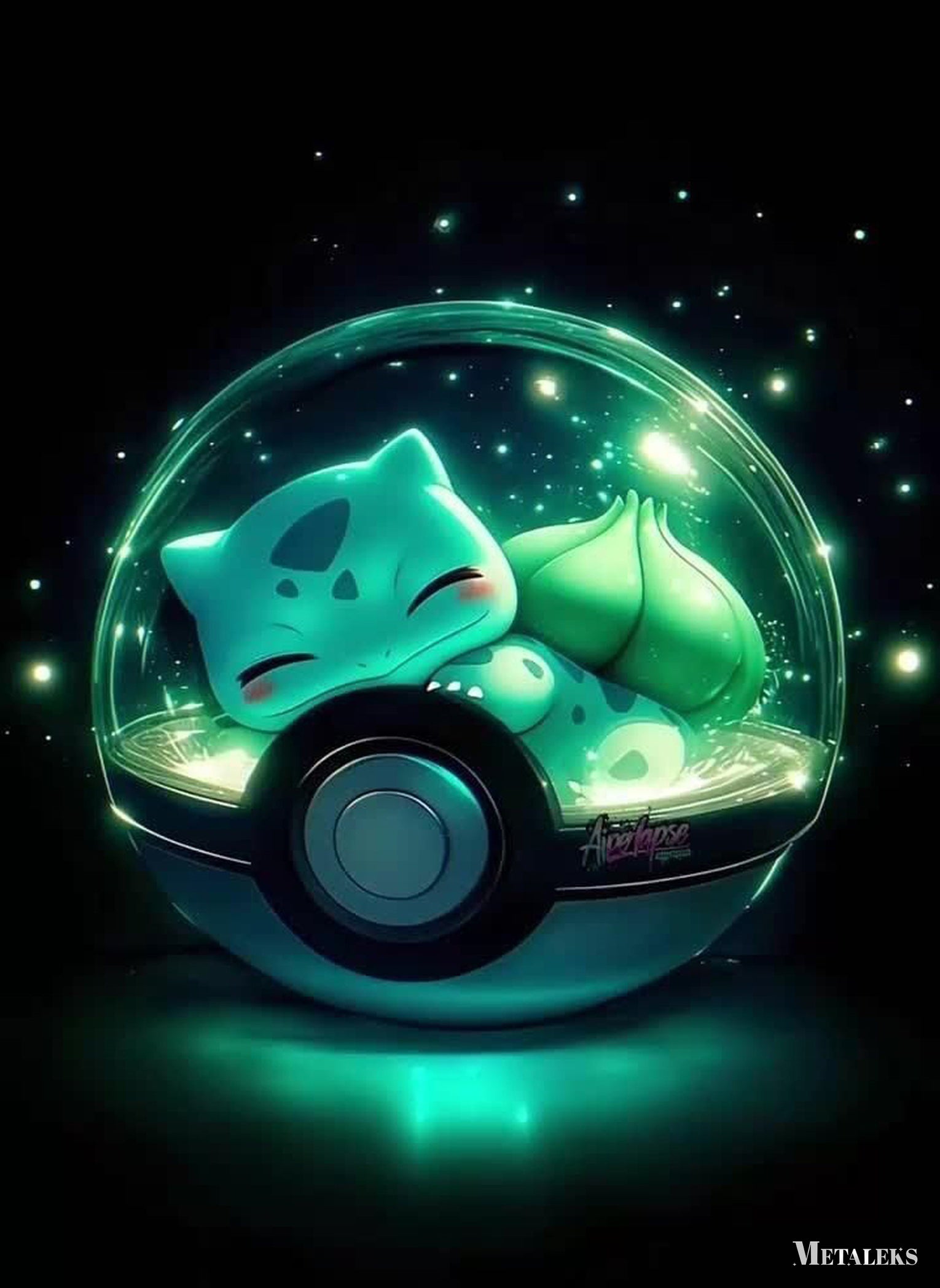 Bulbasaur from Pokémon is sleeping inside a glowing Pokéball.