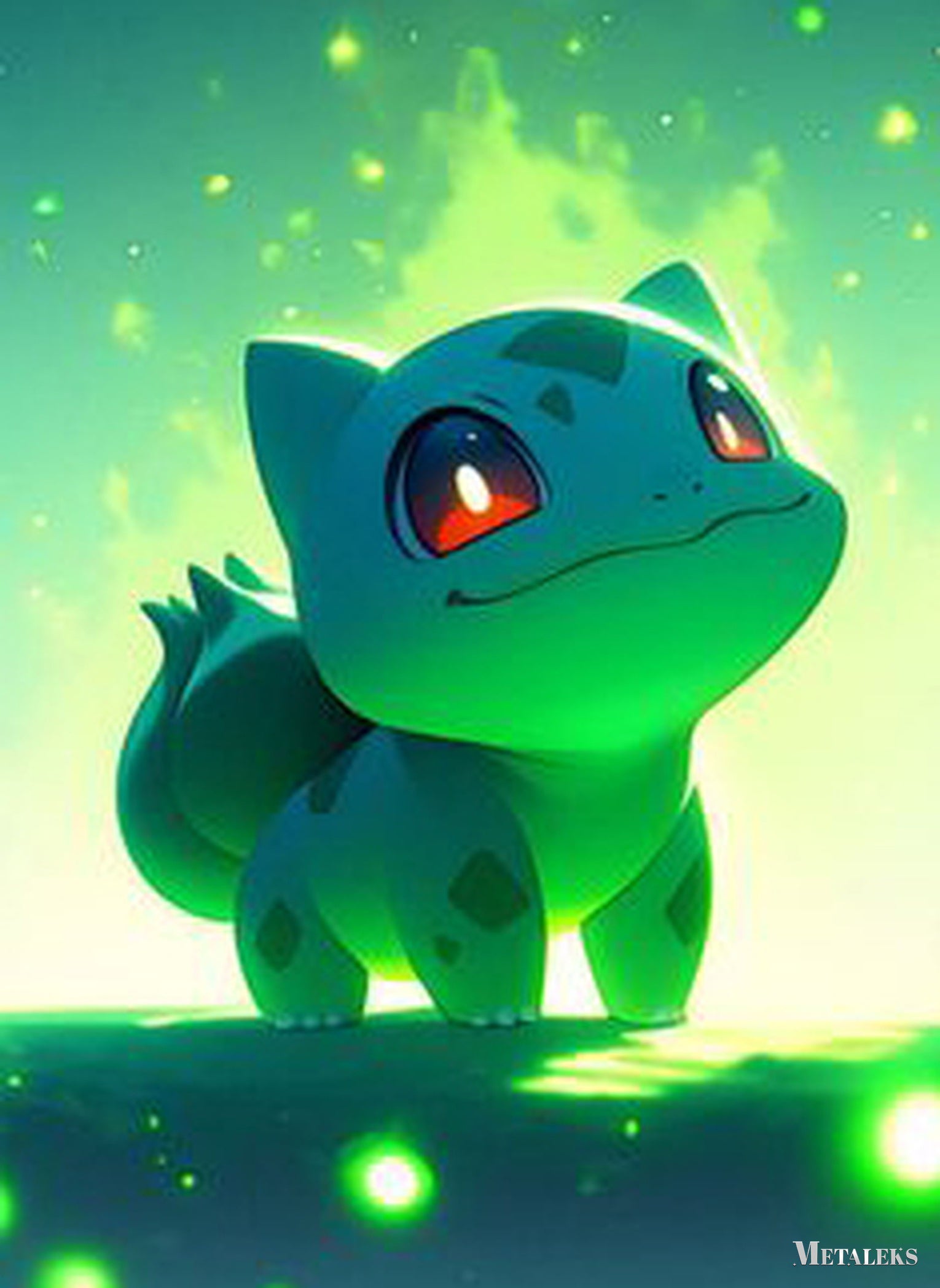 The image shows Bulbasaur from Pokémon. It is a small, quadrupedal creature with a bulb on its back. It has large, red eyes and a happy expression.