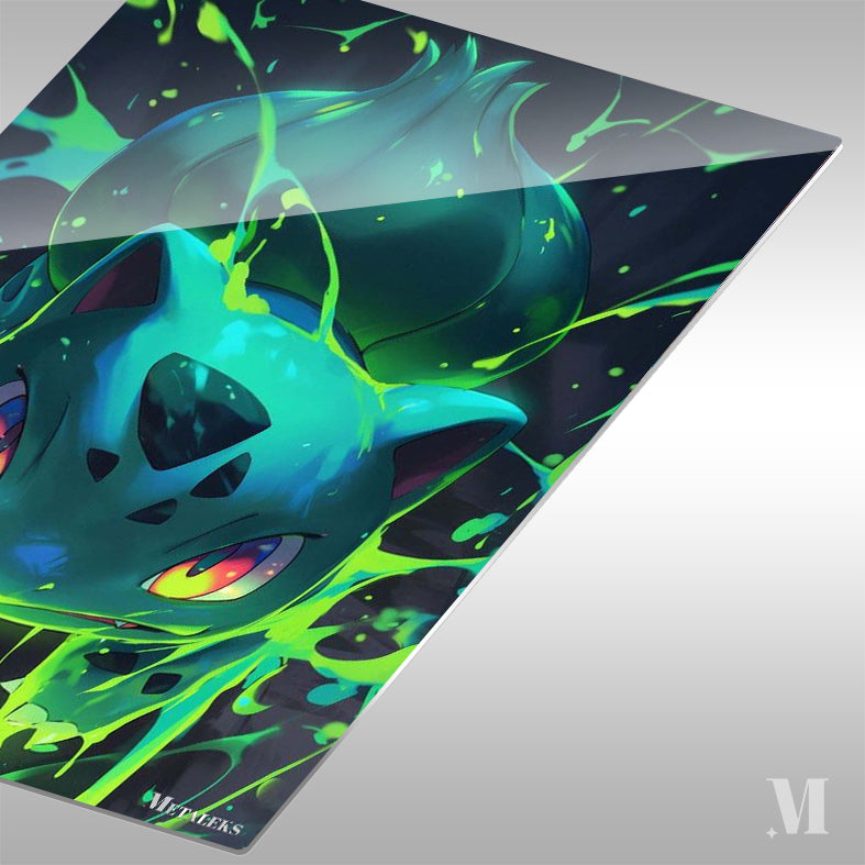 This image features Bulbasaur from Pokémon, rendered in a vibrant, stylized manner with bright green energy effects.