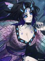 This is a fanart of Daki from Demon Slayer, depicted with horns and markings on her face. She has blue eyes and is wearing a pink and purple kimono.