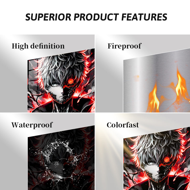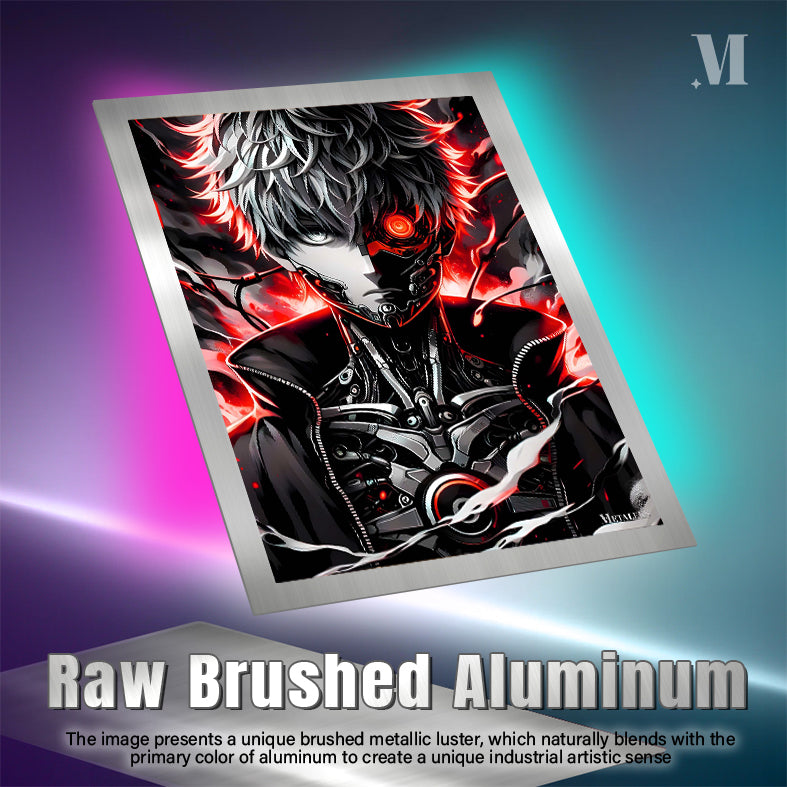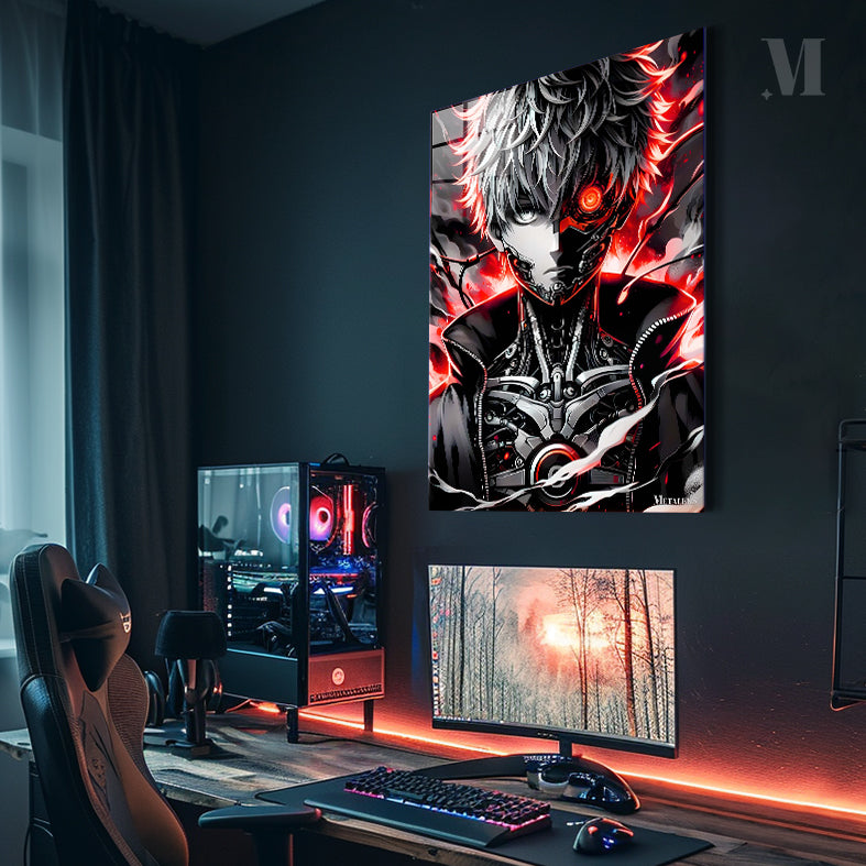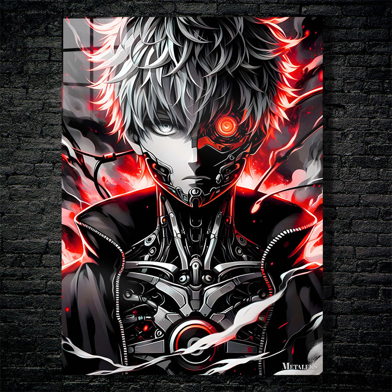 The character has a cybernetic eye and a mechanical face. He is wearing a black jacket with a zipper and a mechanical chest plate. His hair is spiky and white, with red highlights. Metaleks Ultra HD Metal Poster – Create Your Passionate Space.