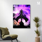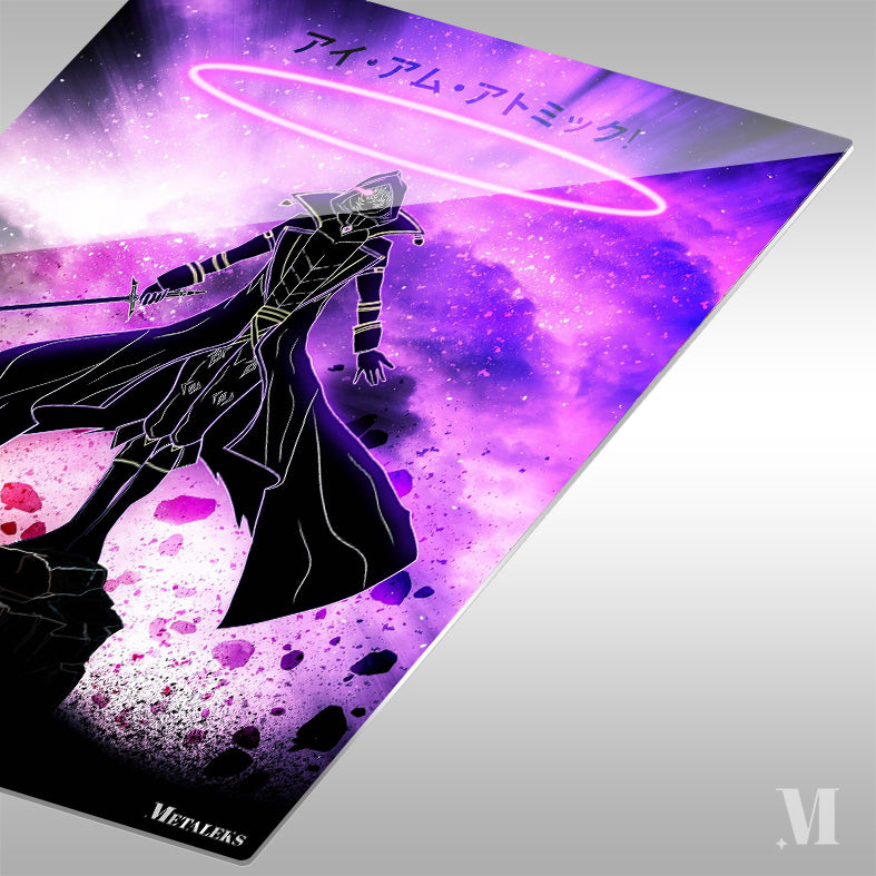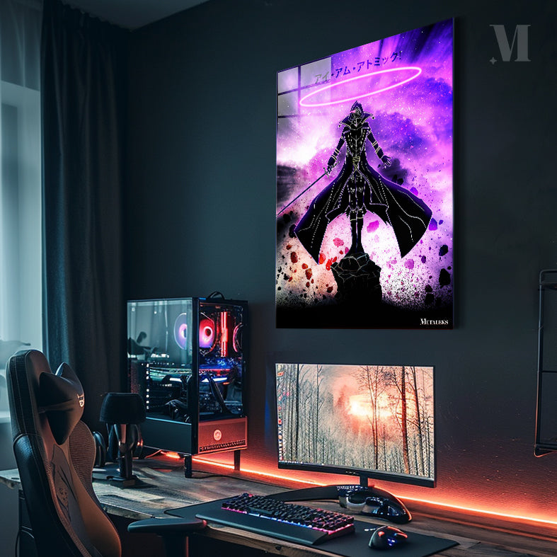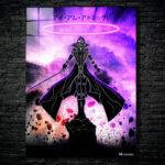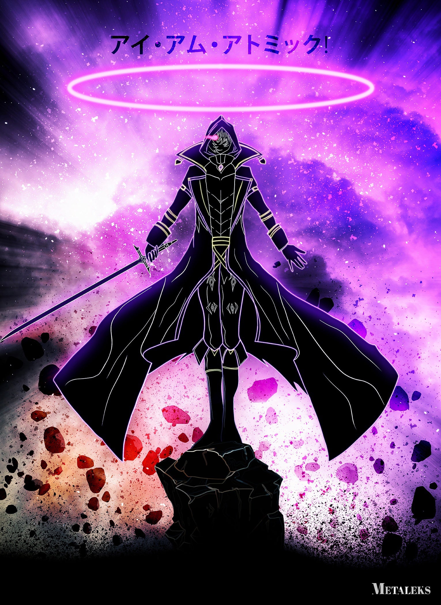 A character in a black robe with a hood stands on a rock, holding a sword in their right hand. The character has a glowing pink ring above their head. The background is a cosmic scene with purple and pink hues. Metaleks Ultra HD Metal Poster – Create Your Passionate Space.