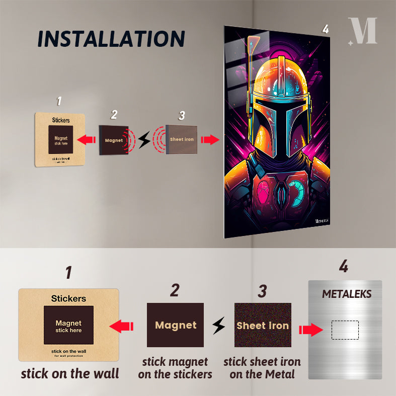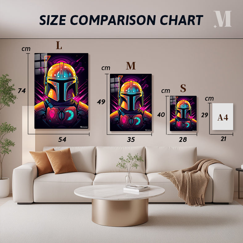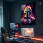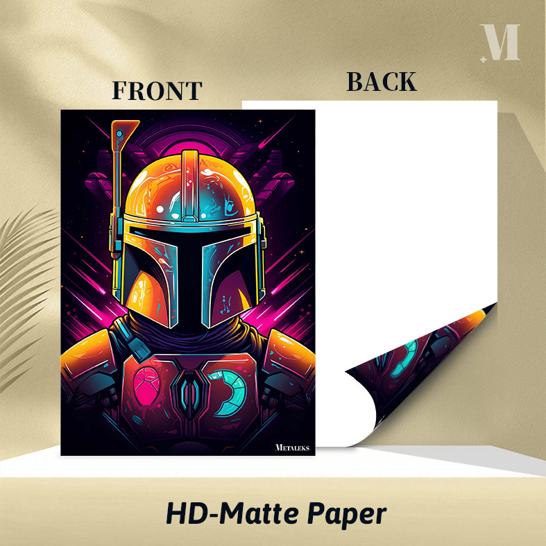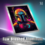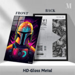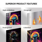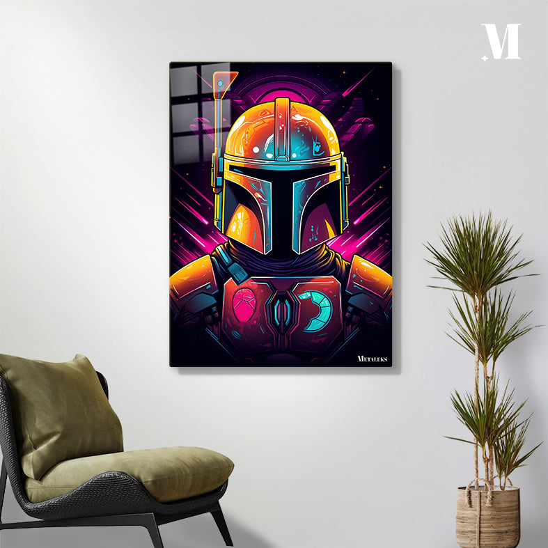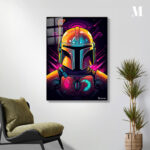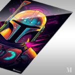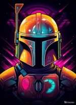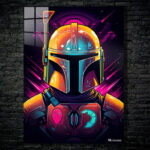 The Mandalorian, a character from the “Star Wars” universe, is depicted wearing his iconic helmet and armor. The helmet is detailed with various colors and textures, including a prominent antenna on the left side. The armor features a distinctive chest plate with symbols, one of which resembles a mudhorn. The overall design is vibrant and stylized, capturing the essence of the character’s appearance. Metaleks Ultra HD Metal Poster – Create Your Passionate Space.