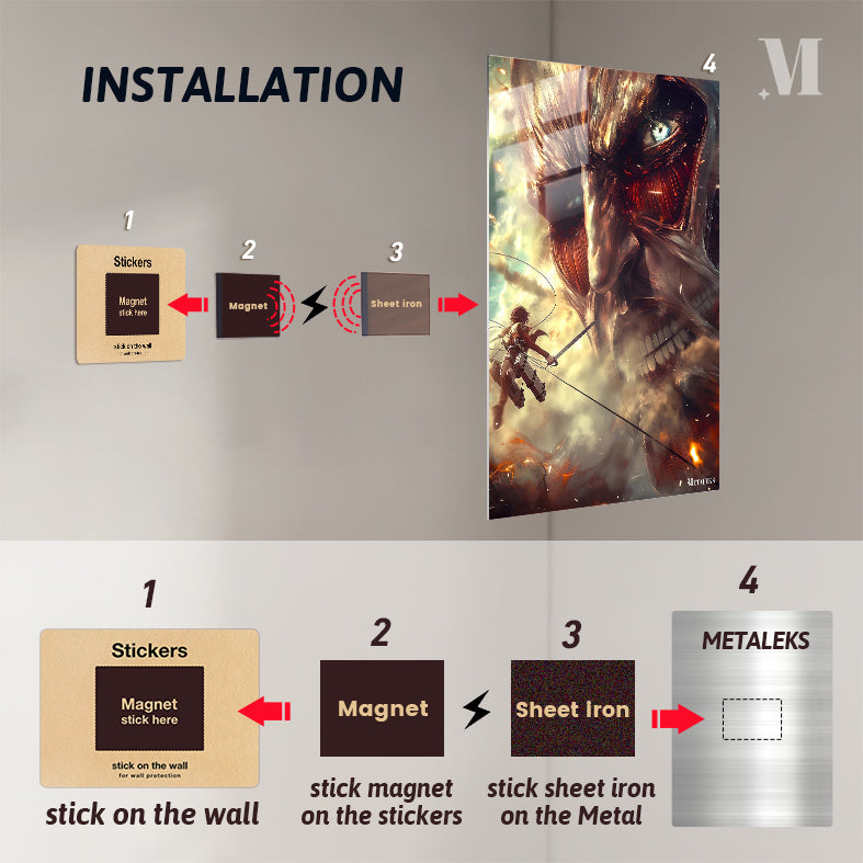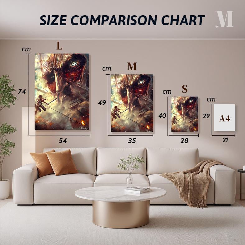 Eren Yeager from “Attack on Titan” is in mid-air, wielding dual blades and grappling with a colossal Titan. Metaleks Ultra HD Metal Poster – Create Your Passionate Space.