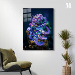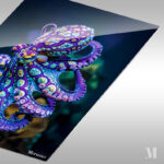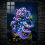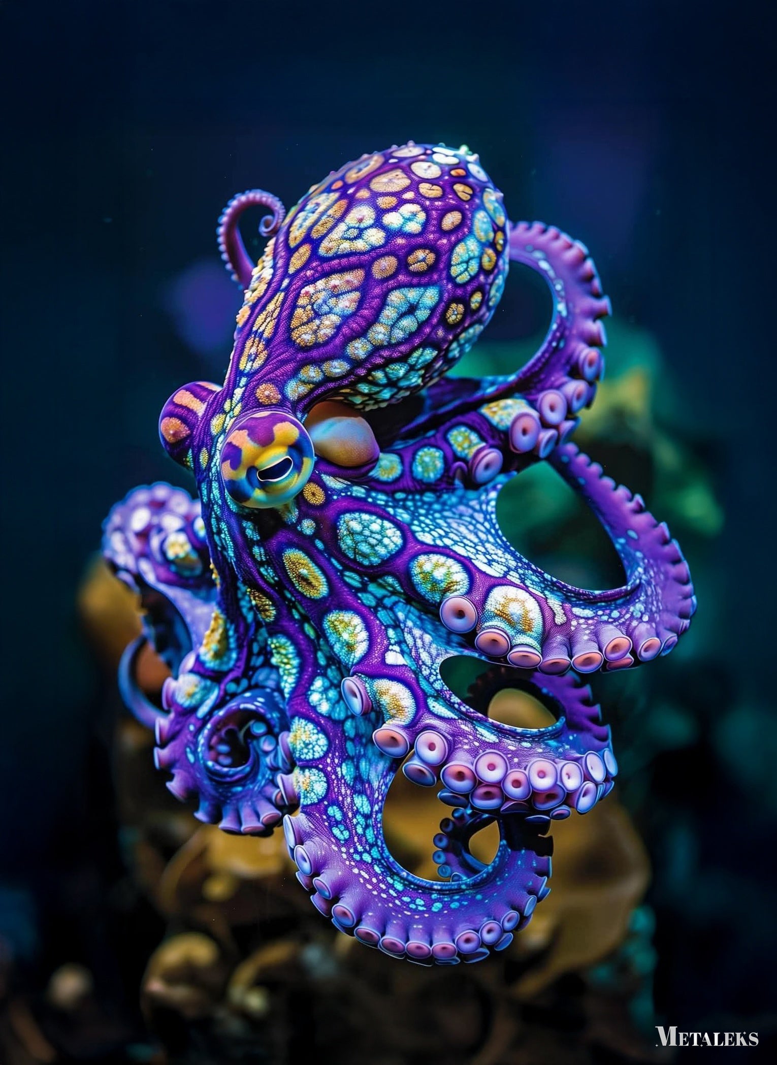A vibrant purple octopus with intricate patterns of blue, yellow, and white spots on its body. Its tentacles are curled and display circular suckers. Metaleks Ultra HD Metal Poster – Create Your Passionate Space.