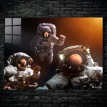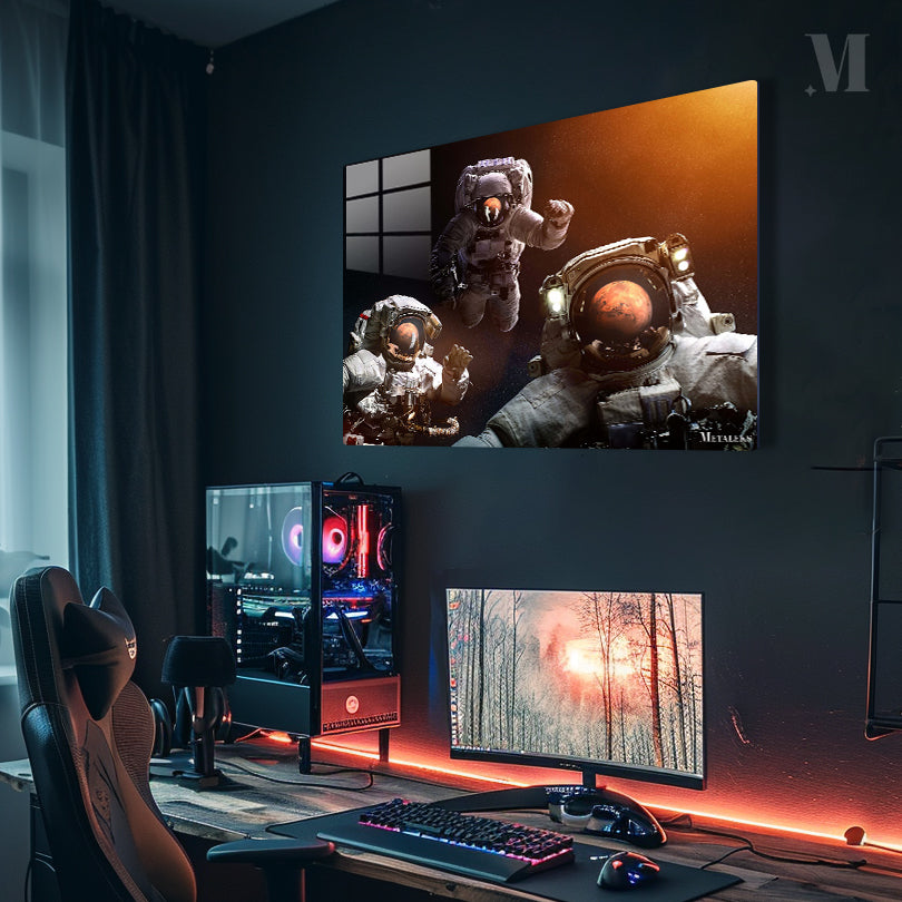 Three astronauts in space suits. One astronaut is floating with an arm raised, another is gesturing with a hand, and the third is in the foreground with helmet lights on. The reflection of Mars is visible in their helmet visors. Metaleks Ultra HD Metal Poster – Create Your Passionate Space.