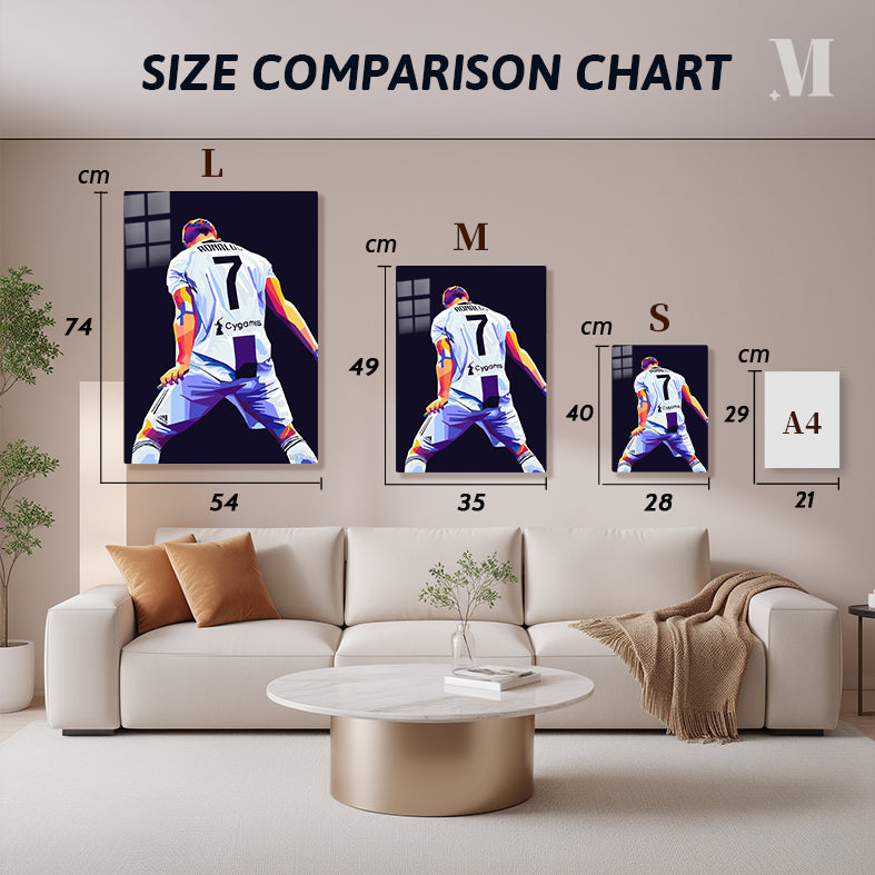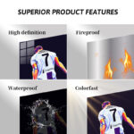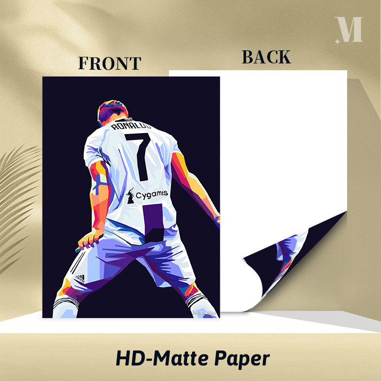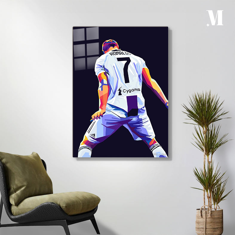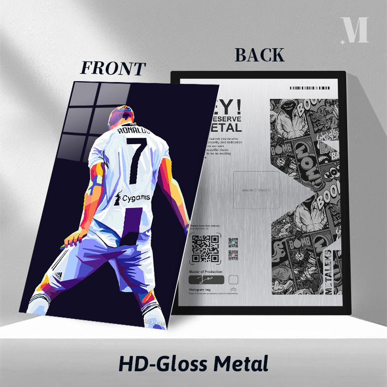 Cristiano Ronaldo wearing a white soccer jersey with the number 7 and “Cygames” on the back. Metaleks Ultra HD Metal Poster – Create Your Passionate Space.