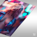 A woman with wavy blonde hair is wearing a shiny, open jacket that reveals her chest. She has a confident and stylish appearance. Metaleks Ultra HD Metal Poster – Create Your Passionate Space.