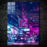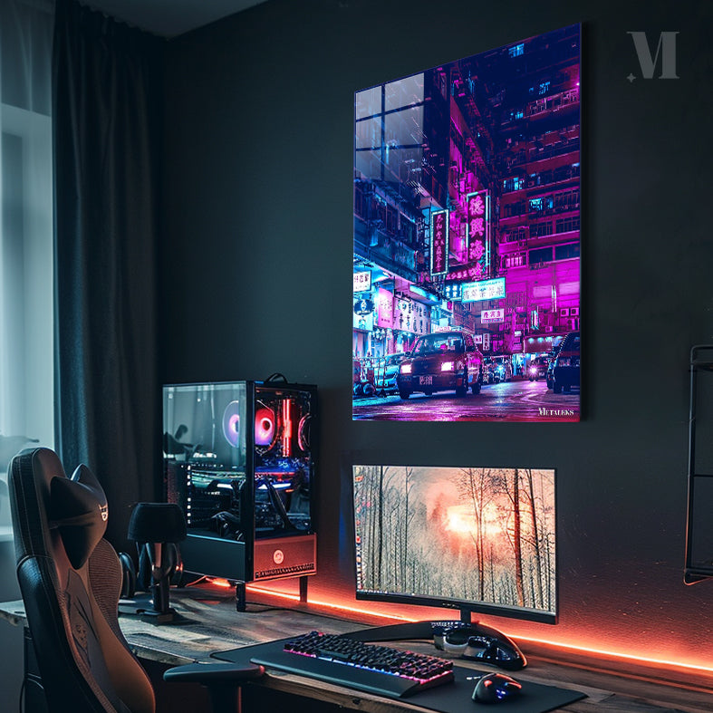 A city street at night with colorful neon signs in Chinese. Metaleks Ultra HD Metal Poster – Create Your Passionate Space.