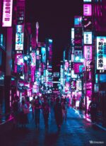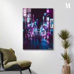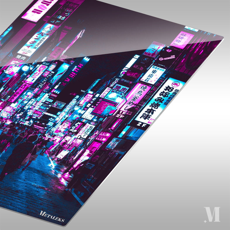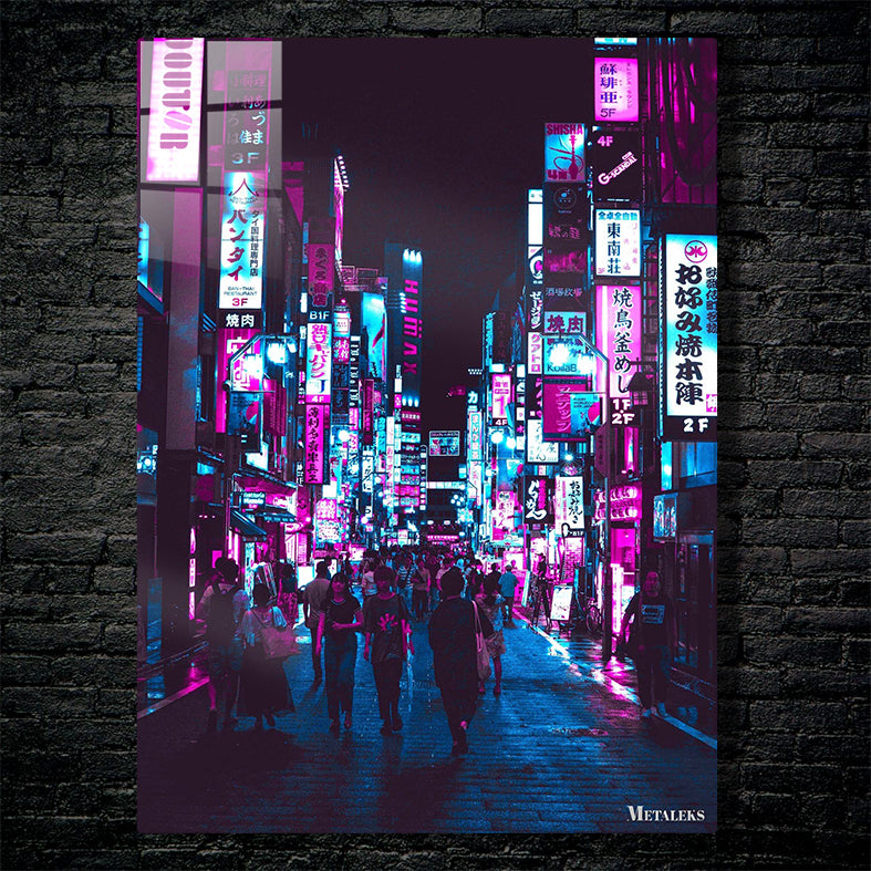 The image shows a busy street at night illuminated by numerous colorful neon signs. The signs are in various colors, including pink, blue, and purple, and display text in what appears to be Japanese. The street is crowded with people walking in different directions, some carrying bags. The overall atmosphere is vibrant and lively, typical of a bustling urban area at night. Metaleks Ultra HD Metal Poster – Create Your Passionate Space.