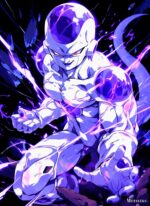 Frieza from Dragon Ball is depicted in a dynamic pose, kneeling with one hand extended forward and the other clenched. He has a menacing expression with red eyes. His body is white with purple accents, and there are purple energy effects surrounding him.