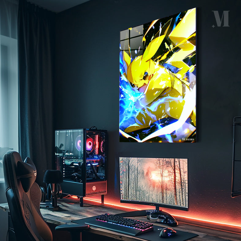 Pikachu from Pokemon is crouched down, preparing to attack with electricity crackling around him.