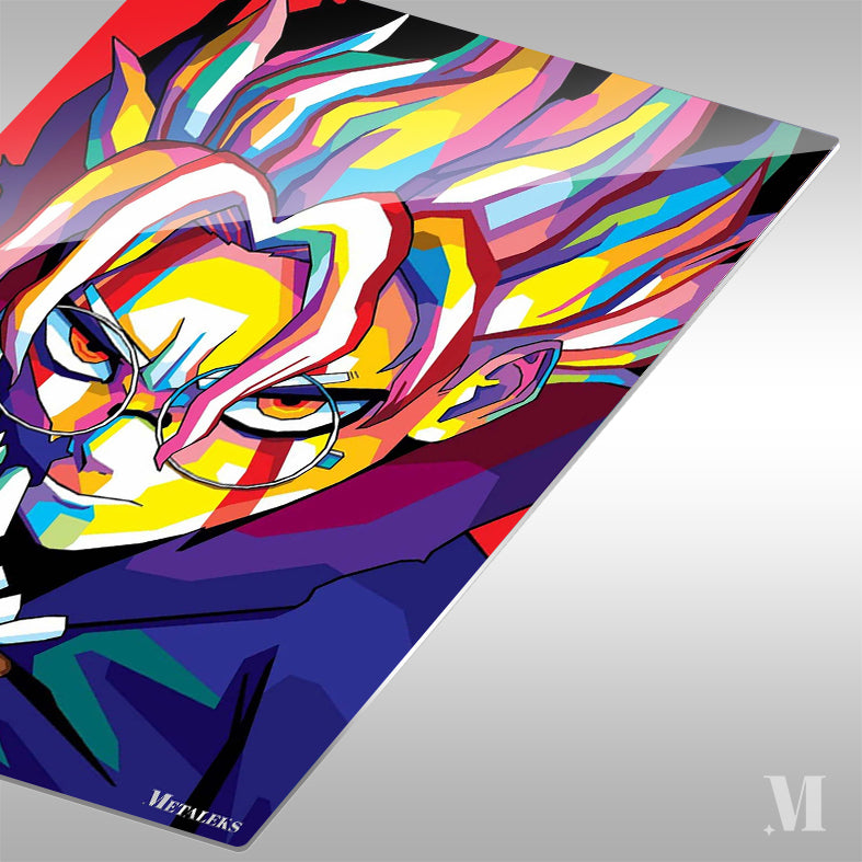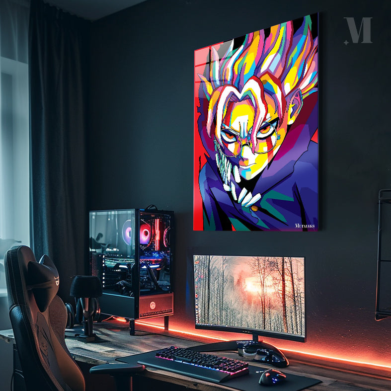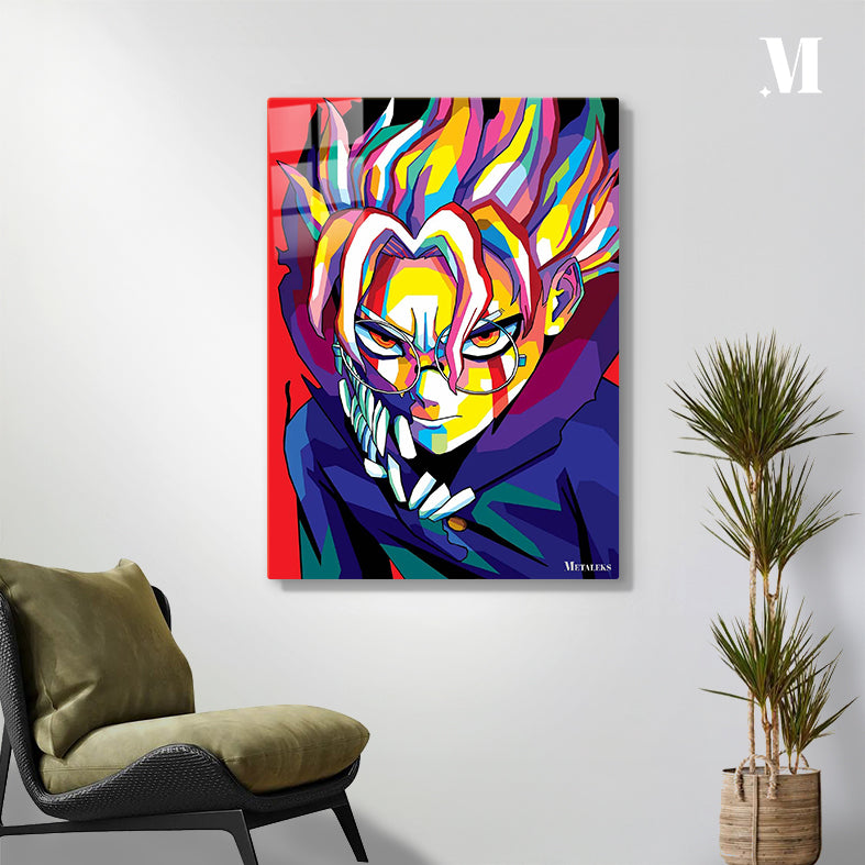 A character from “Dr. Stone” with colorful, stylized hair, wearing glasses and a dark coat. Metaleks Ultra HD Metal Poster – Create Your Passionate Space.