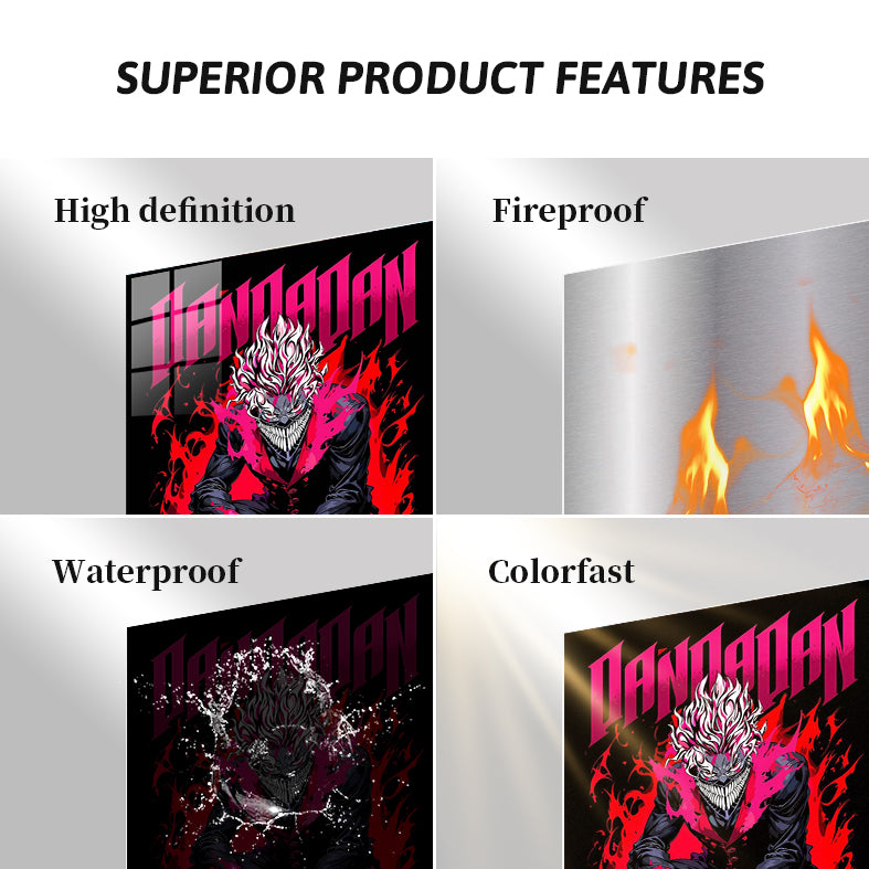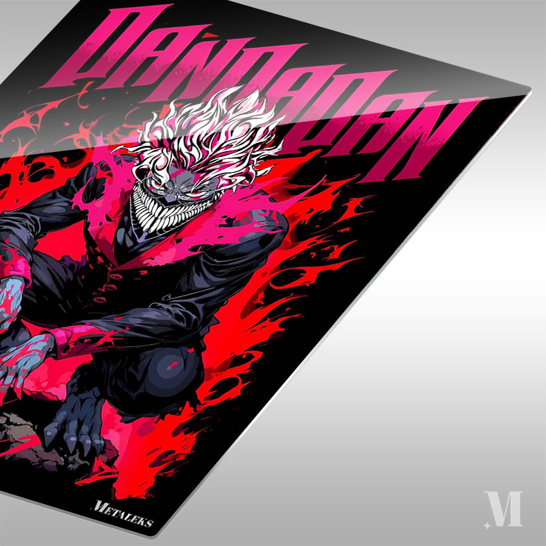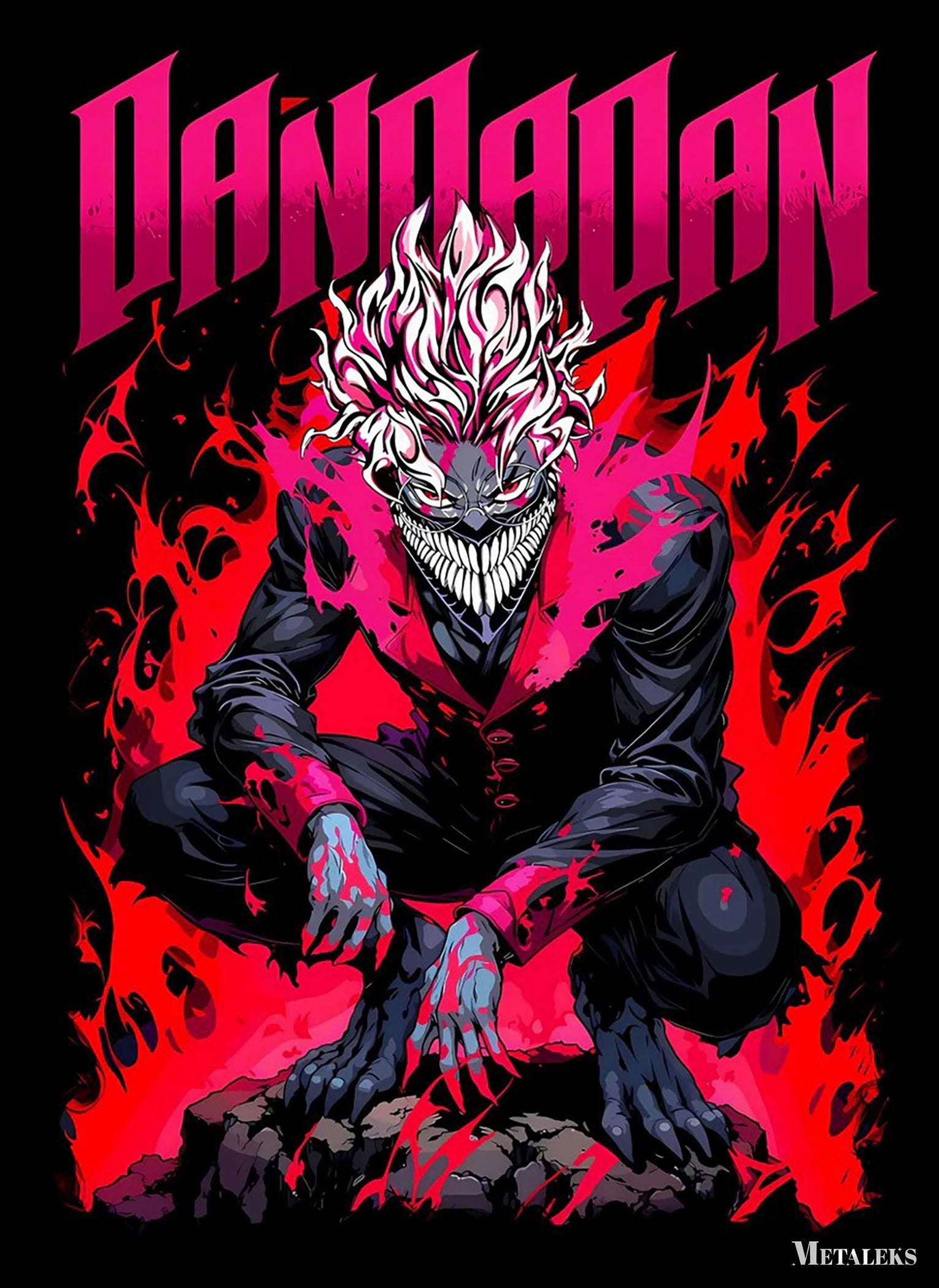 A character from “Dandadan” with a fierce appearance, surrounded by red flames, and the title “DANDADAN” above. Metaleks Ultra HD Metal Poster – Create Your Passionate Space.