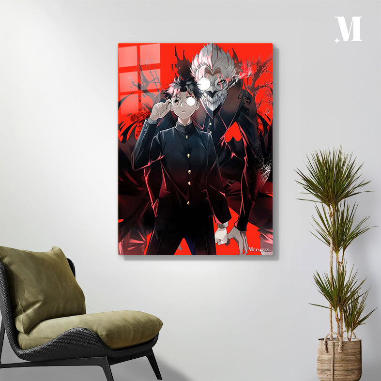 The image features Yuta Okkotsu from “Jujutsu Kaisen” in a black school uniform, adjusting his glasses, with his cursed spirit counterpart behind him, displaying a menacing appearance against a red background. Metaleks Ultra HD Metal Poster – Create Your Passionate Space.