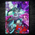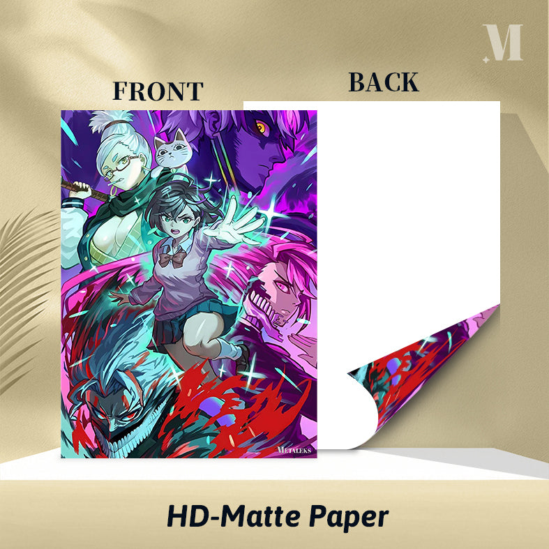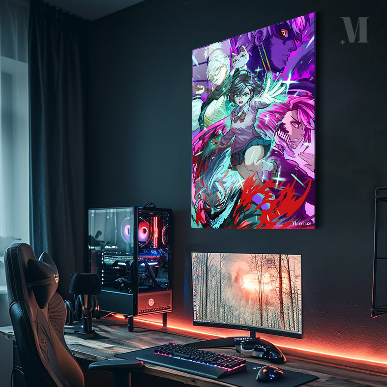 The image features characters from the anime “Chainsaw Man,” including a central character in a school uniform and other distinctive characters with vibrant and dynamic designs. Metaleks Ultra HD Metal Poster – Create Your Passionate Space.