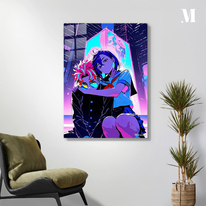 Two anime characters from “PROMARE” are depicted, with one having colorful hair and yellow glasses, and the other with blue hair in a school uniform, set against a neon-lit city backdrop. Metaleks Ultra HD Metal Poster – Create Your Passionate Space.
