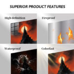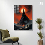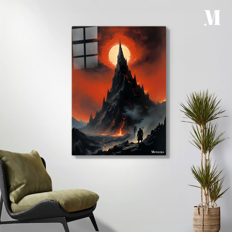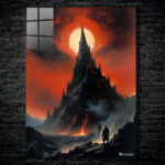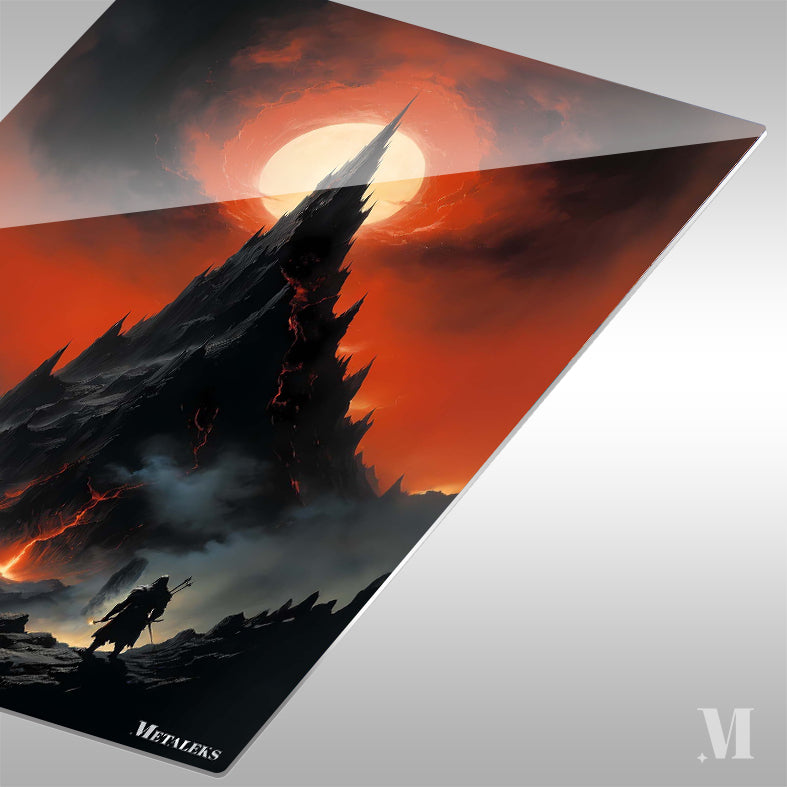 A towering, jagged mountain with a spire at the top, surrounded by a fiery, red sky with a large, glowing moon. Metaleks Ultra HD Metal Poster – Create Your Passionate Space.