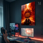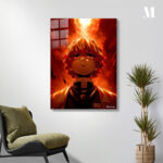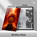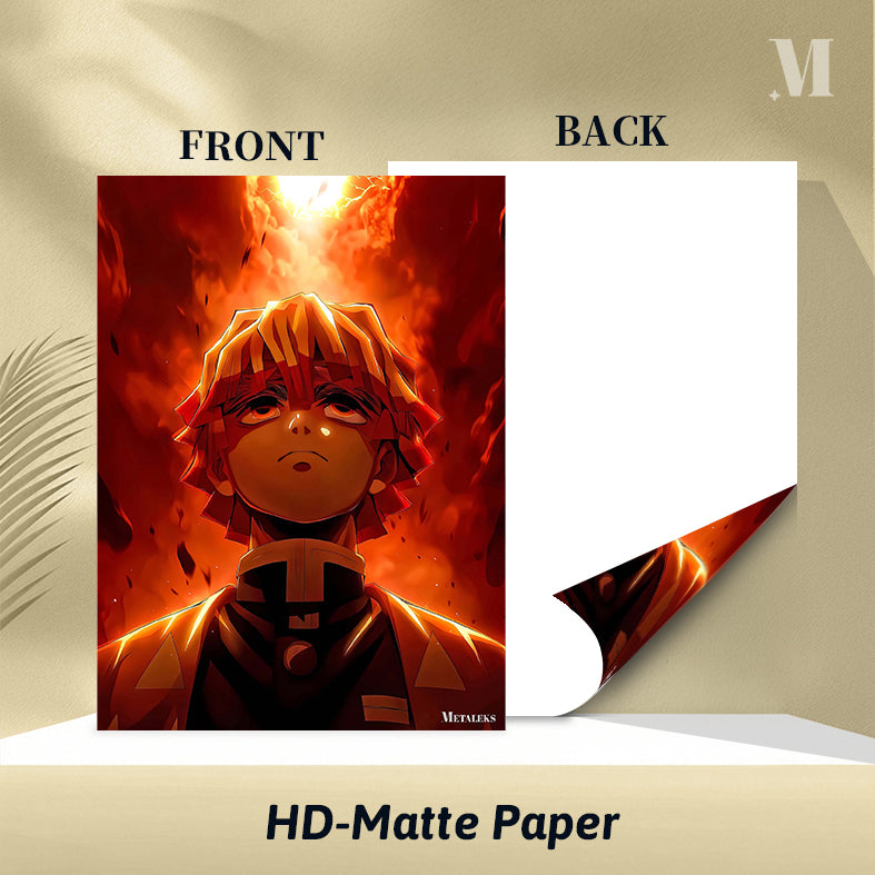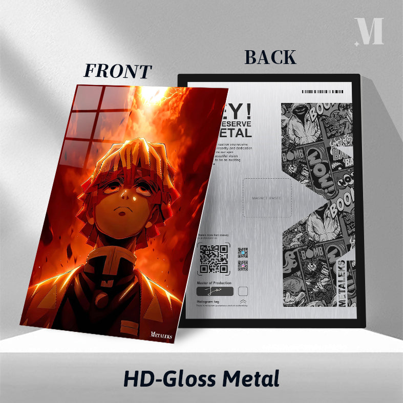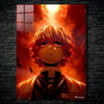 Zenitsu Agatsuma from “Demon Slayer: Kimetsu no Yaiba” is depicted with a fiery backdrop. Metaleks Ultra HD Metal Poster – Create Your Passionate Space.