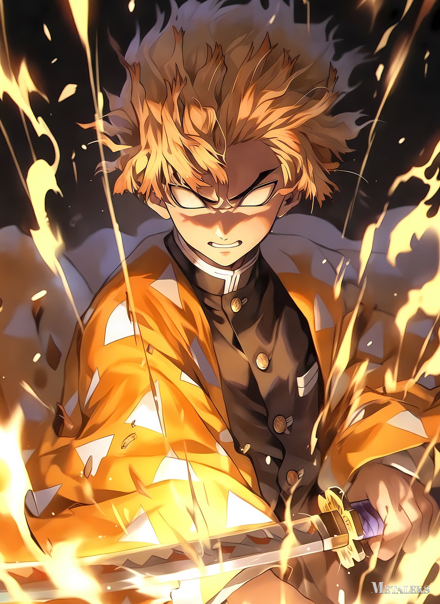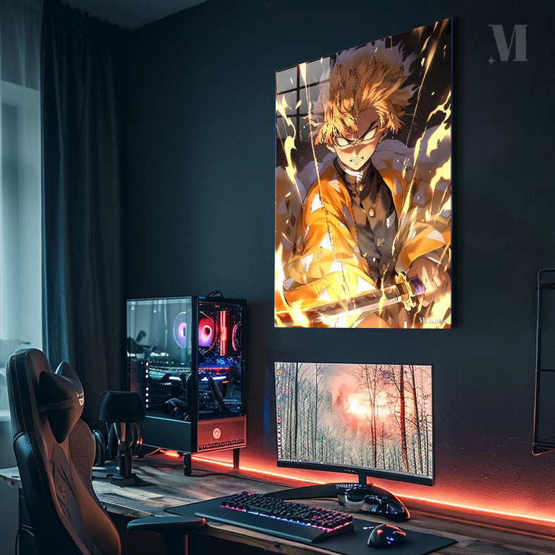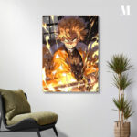 Rengoku Kyoujurou from Demon Slayer is surrounded by flames, holding a sword, and wearing a haori with a flame pattern. Metaleks Ultra HD Metal Poster – Create Your Passionate Space.