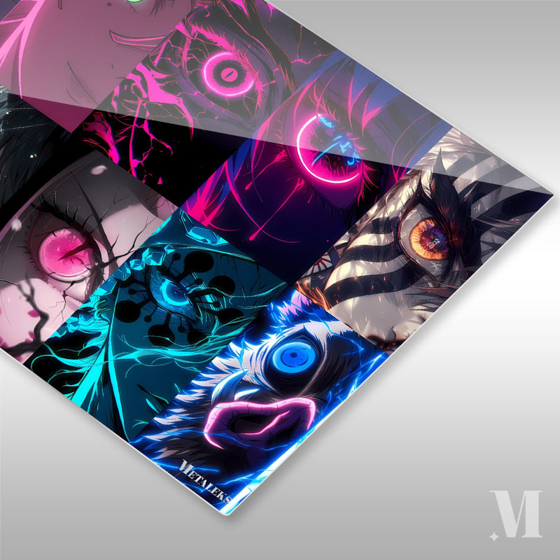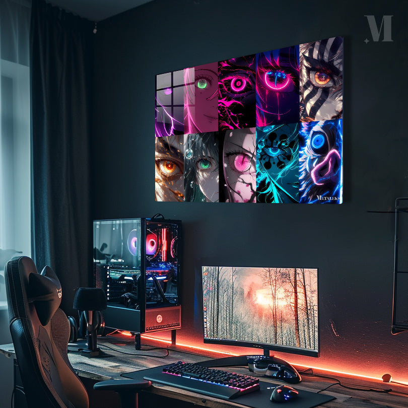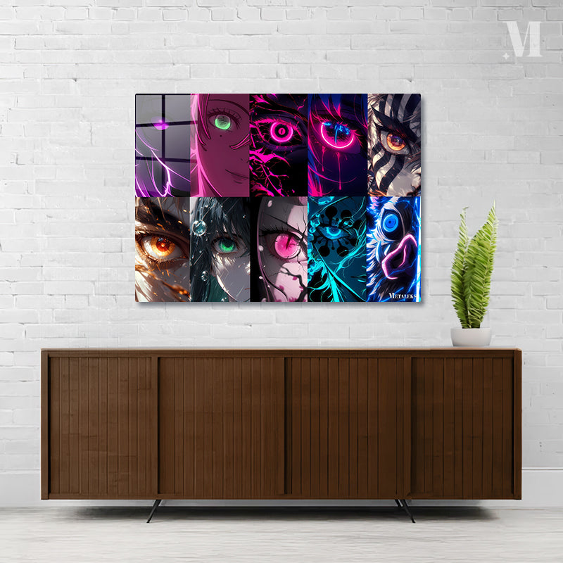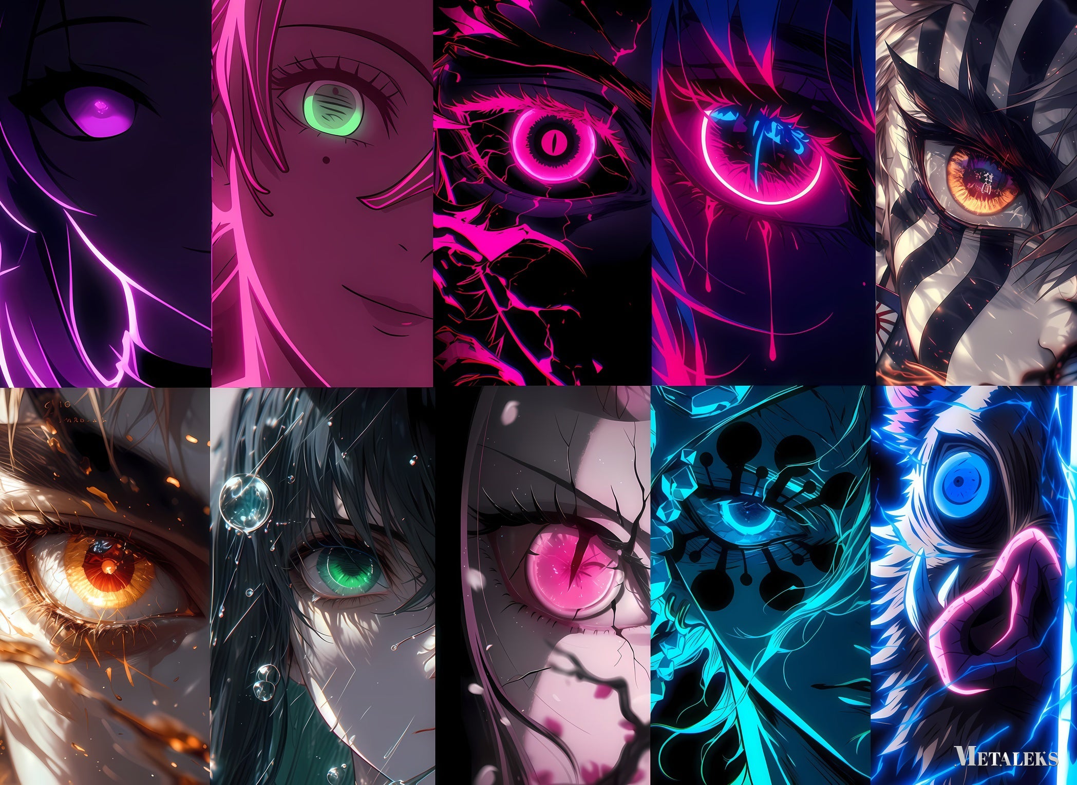 This image features a collection of vibrant and dynamic eye illustrations. Each eye is unique, with striking colors and intricate designs. The top row includes eyes with purple, green, pink, and blue hues, some with glowing effects and others with detailed patterns. The bottom row showcases eyes with orange, green, pink, and blue tones, featuring elements like fire, water droplets, and abstract designs. The overall style is highly stylized and reminiscent of anime and digital art. Metaleks Ultra HD Metal Poster – Create Your Passionate Space.
