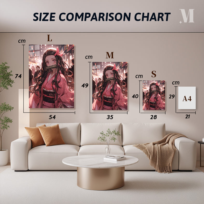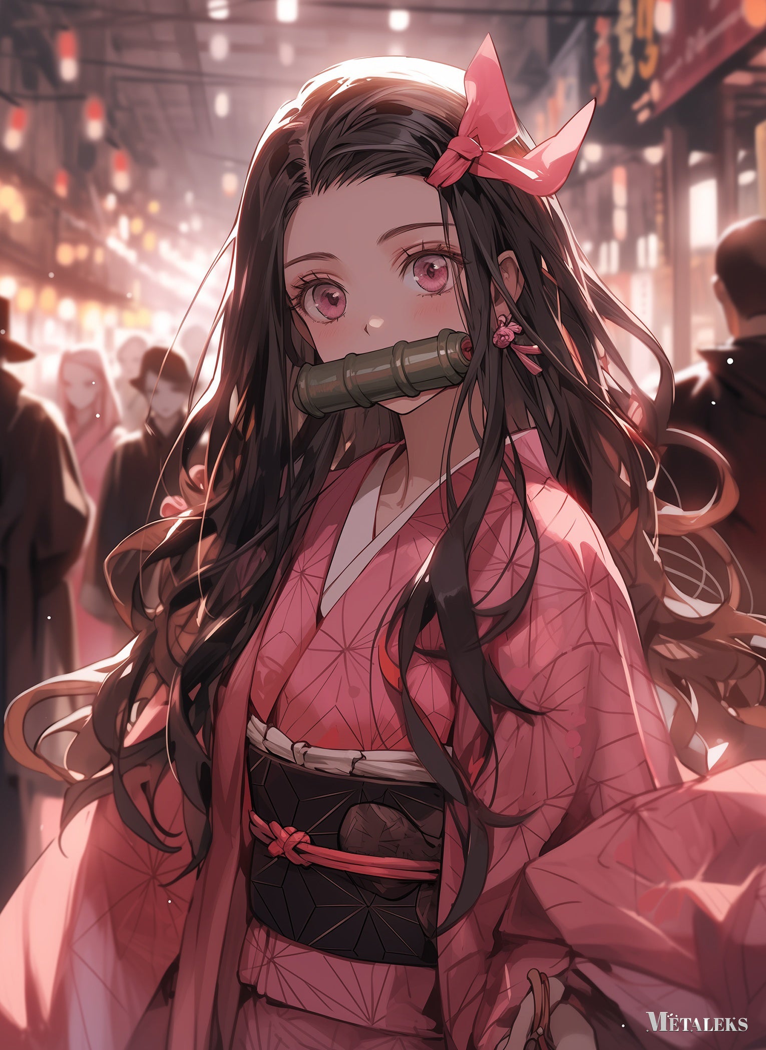 Nezuko Kamado from Demon Slayer has long black hair with a pink bow, wears a pink kimono, and has a bamboo muzzle in her mouth. Metaleks Ultra HD Metal Poster – Create Your Passionate Space.