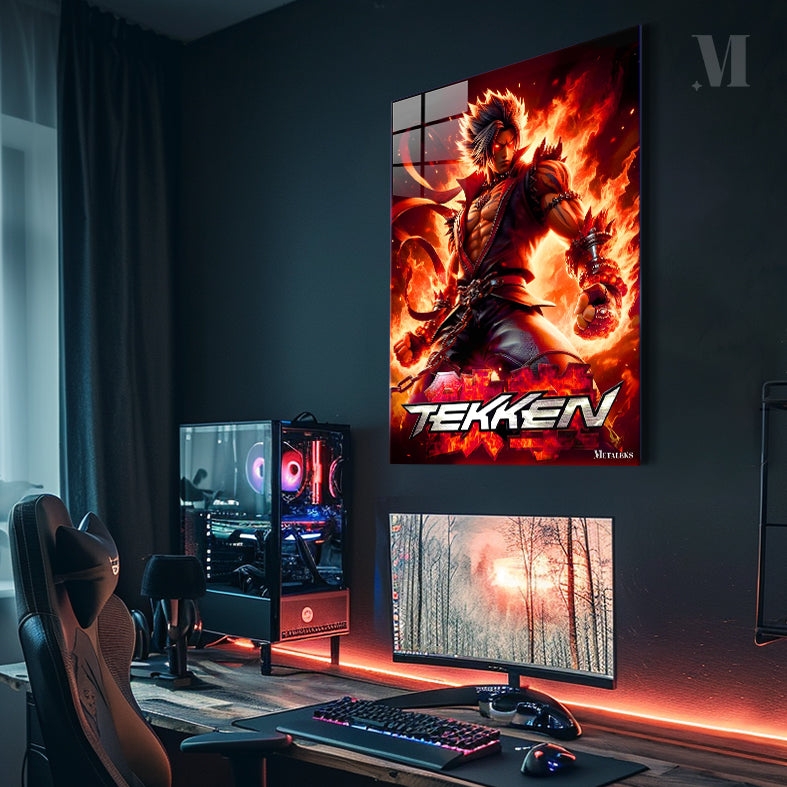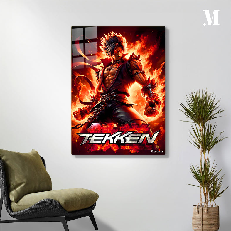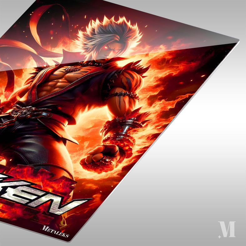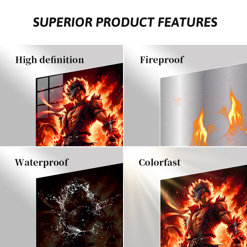 A muscular character with spiky hair, wearing a red and black outfit with chains and spiked accessories, stands with fists clenched, surrounded by flames. Metaleks Ultra HD Metal Poster – Create Your Passionate Space.