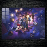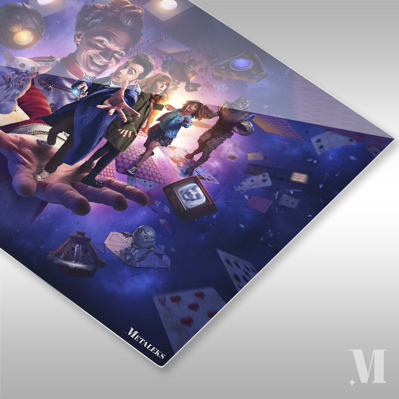 The image features characters from the TV series “Doctor Who.” A large hand holds a man in a blue coat, a woman in a green coat, and a girl in a blue jacket. There is also a white, furry creature on a playing card. The background is filled with various objects like TVs, robots, and playing cards. Metaleks Ultra HD Metal Poster – Create Your Passionate Space.