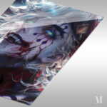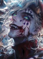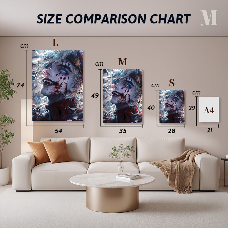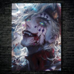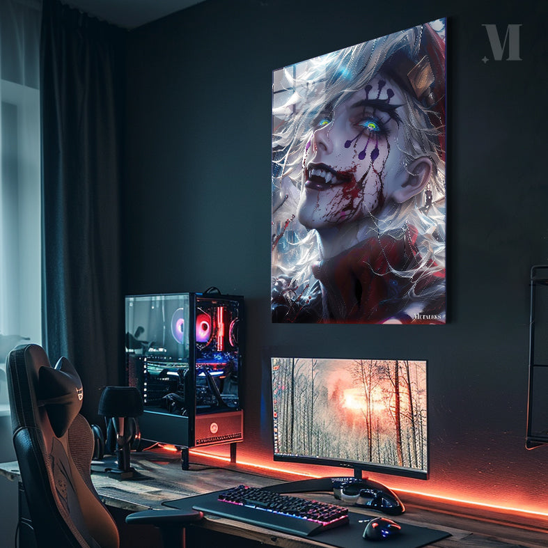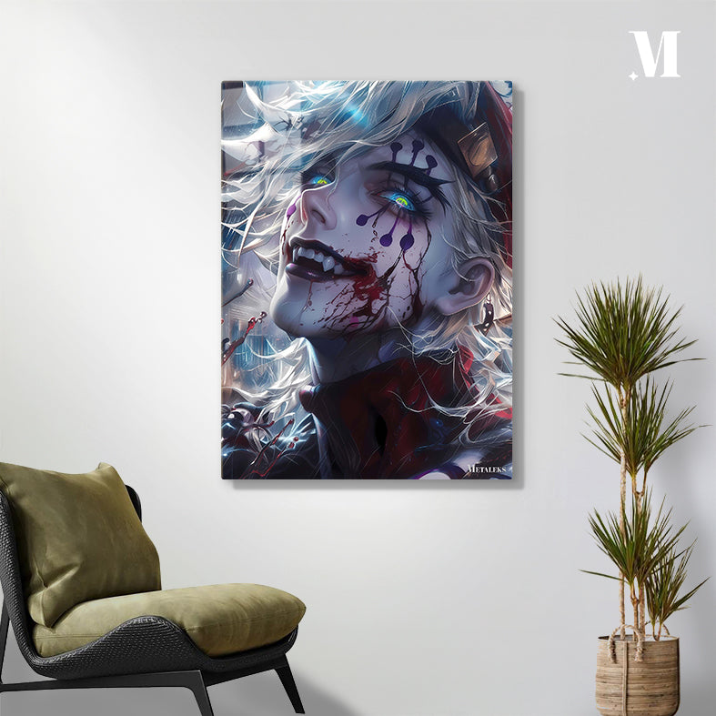 A character with white hair and colorful, glowing eyes. The character has dark makeup on their face, including purple shapes and red streaks that resemble blood. The character is smiling with sharp teeth, and there is a red and black outfit visible. Metaleks Ultra HD Metal Poster – Create Your Passionate Space.