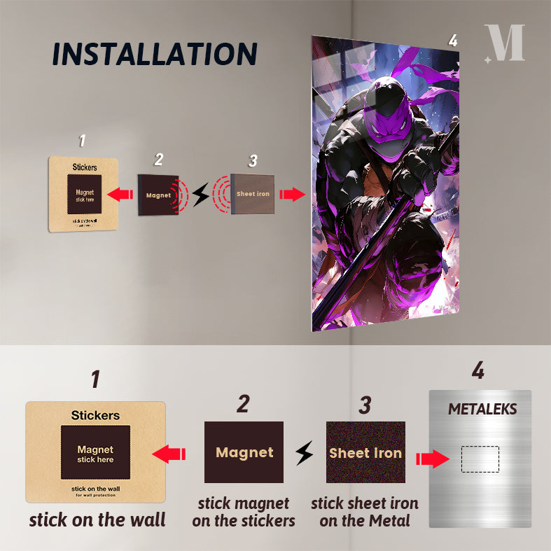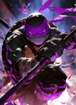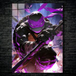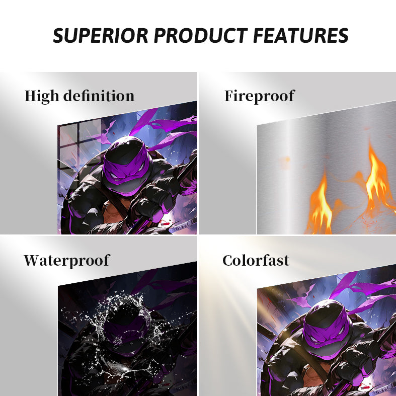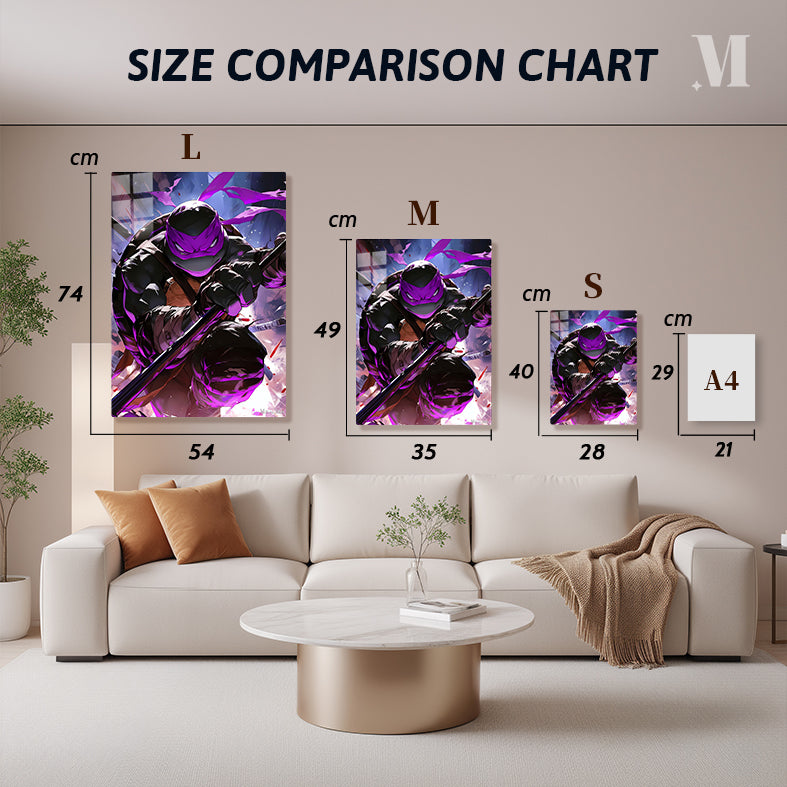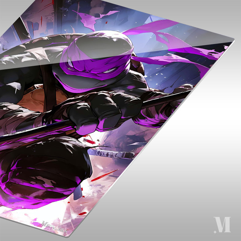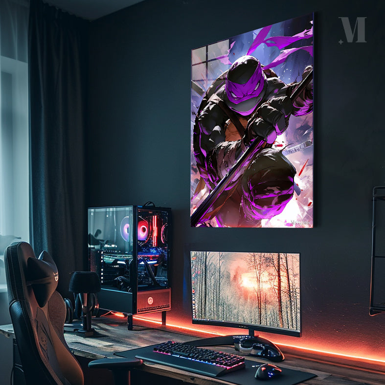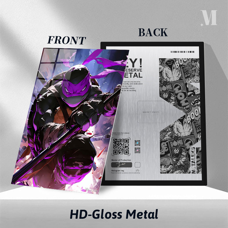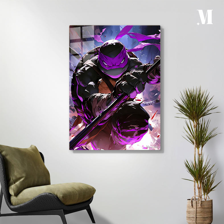 Raphael, from Teenage Mutant Ninja Turtles, is in a dynamic pose, holding a staff, with a purple mask and intense expression. Metaleks Ultra HD Metal Poster – Create Your Passionate Space.