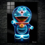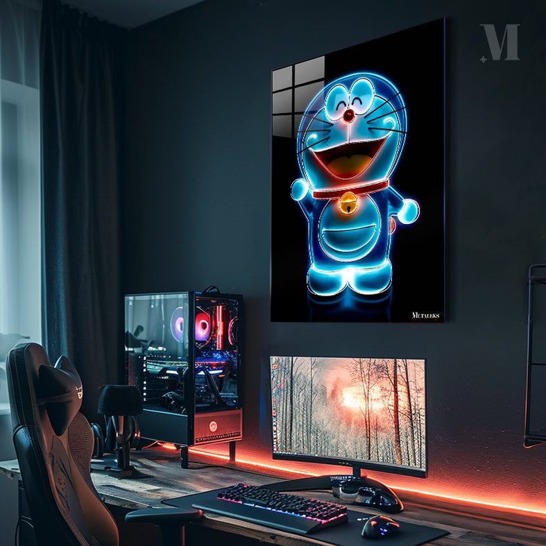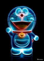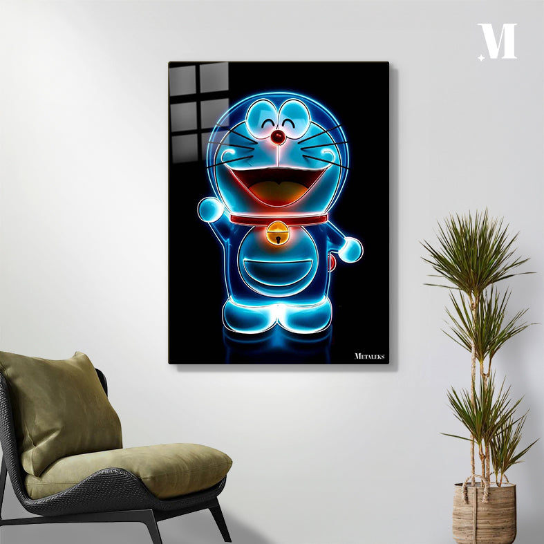 Doraemon from the manga and anime series of the same name is depicted as a glowing blue figure with a red collar and a yellow bell. He is smiling with his eyes closed and his mouth open, and he is waving his left hand.