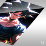 Goku from Dragon Ball is depicted with an intense expression, his spiky black hair radiating light. He’s wearing a blue shirt over his orange martial arts uniform, and his muscular build is emphasized by the lighting.