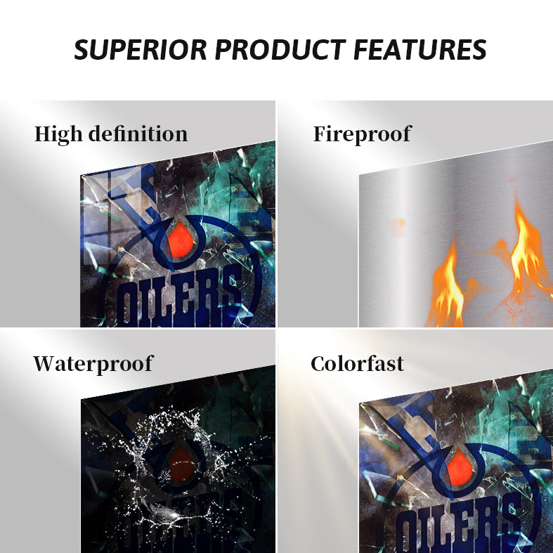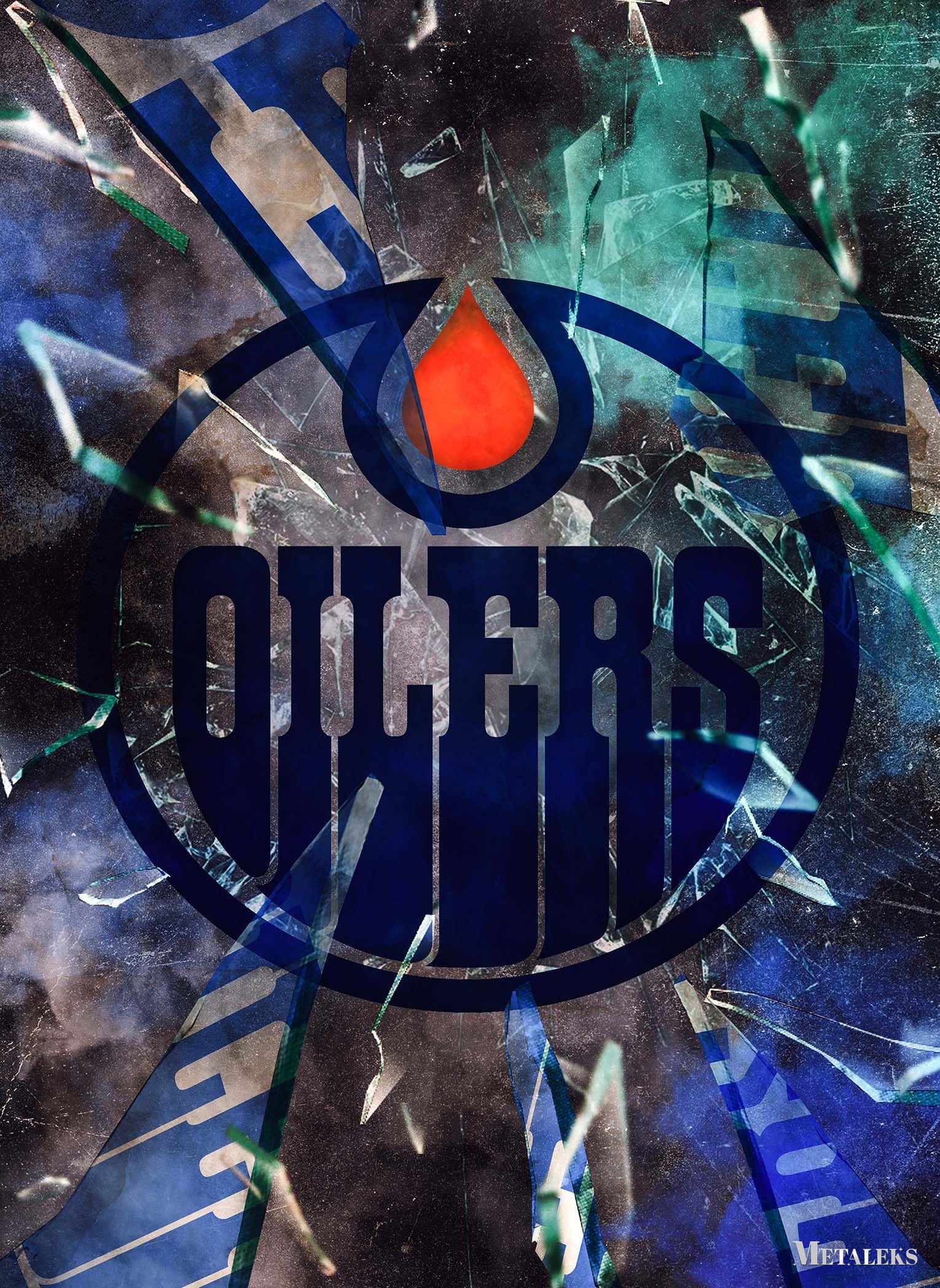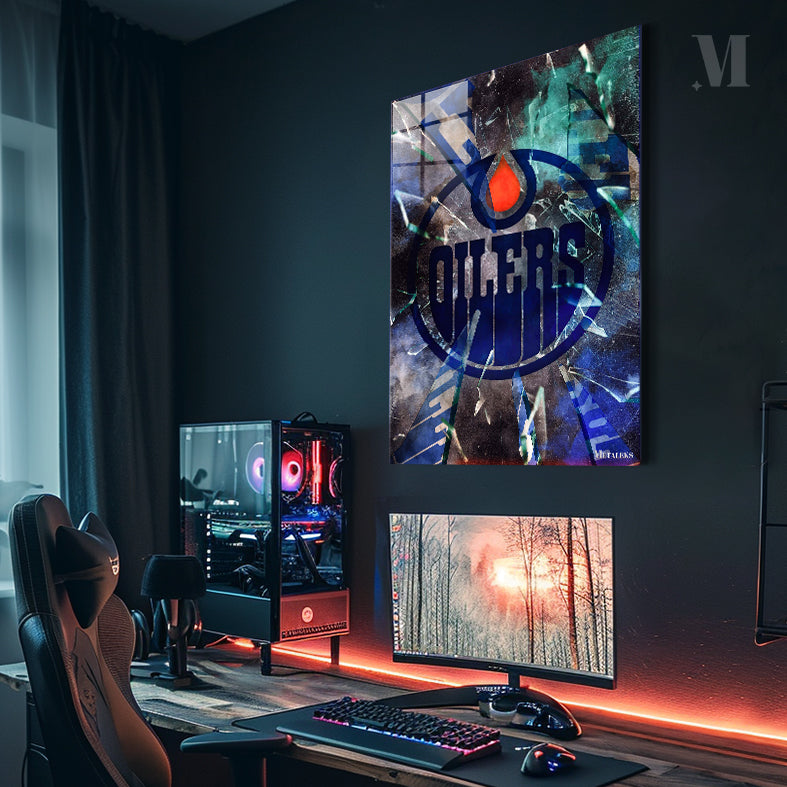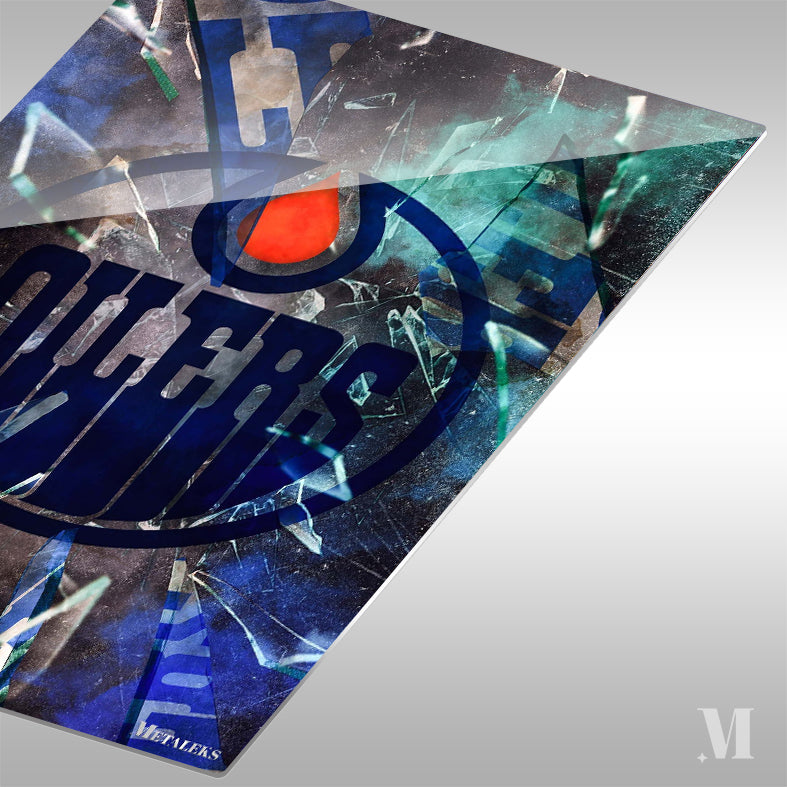 The image features the logo of the Edmonton Oilers, prominently displaying the word “OILERS” in blue within a circular design, with a red drop shape at the center, set against a backdrop of shattered glass. Metaleks Ultra HD Metal Poster – Create Your Passionate Space.