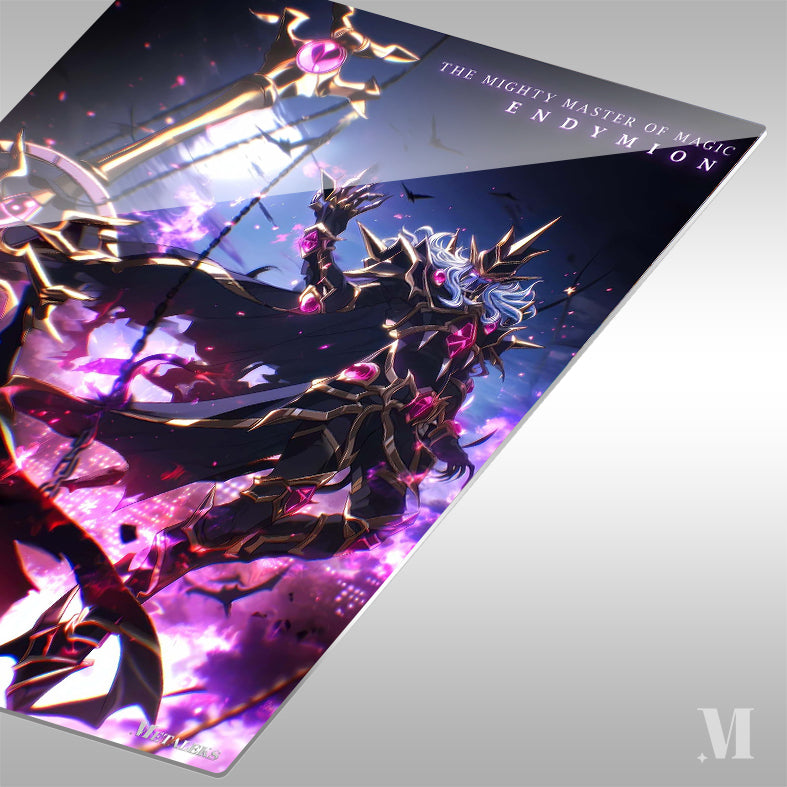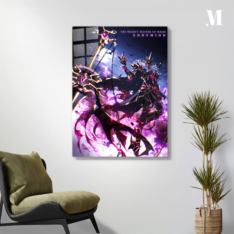 The Mighty Master of Magic Endymion is depicted wielding a large, ornate staff. He is dressed in dark, spiked armor with pink gem accents. His long, flowing hair and dramatic pose suggest power and dominance. Metaleks Ultra HD Metal Poster – Create Your Passionate Space.