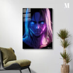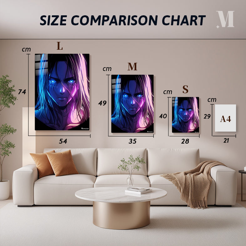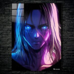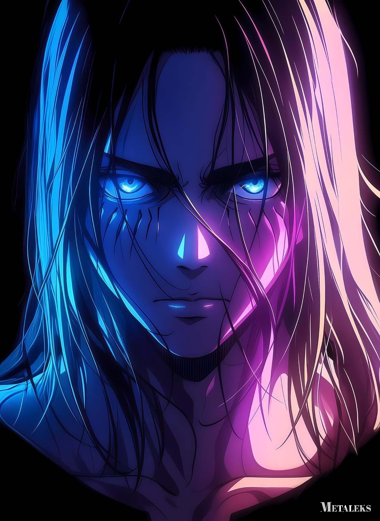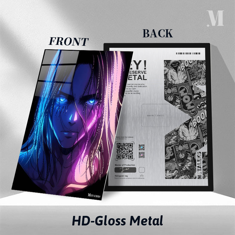 Eren Yeager from Attack on Titan has long hair and intense blue eyes. Metaleks Ultra HD Metal Poster – Create Your Passionate Space.
