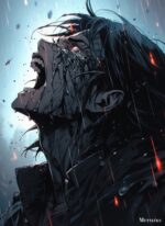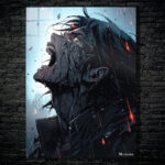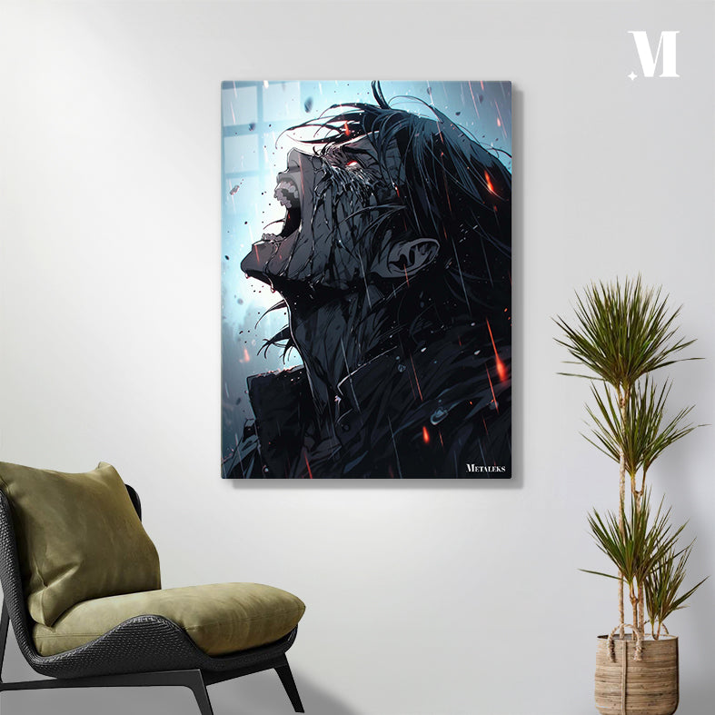 A person with long dark hair is shown in a dramatic pose, with water or some liquid streaming down their face and hair. Their mouth is open wide, possibly in a scream or shout, and their eyes are glowing red. The scene is intense and emotional. Metaleks Ultra HD Metal Poster – Create Your Passionate Space.