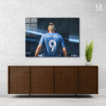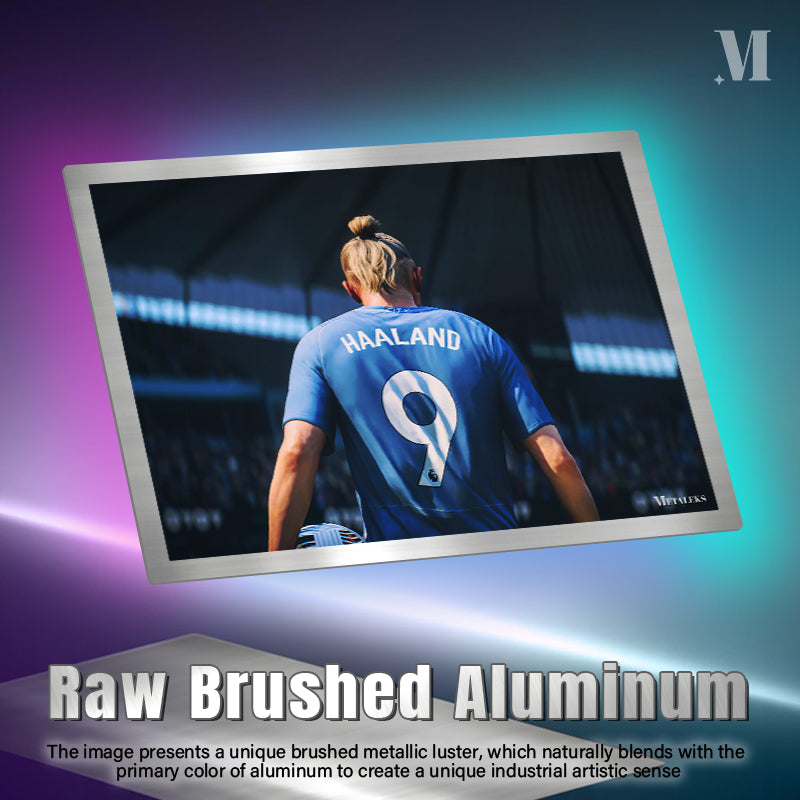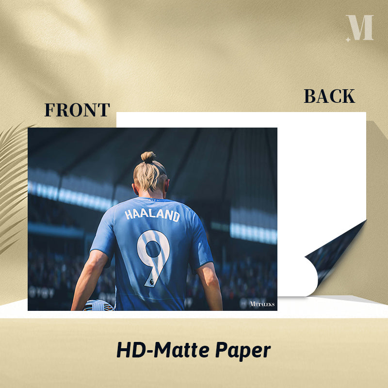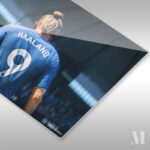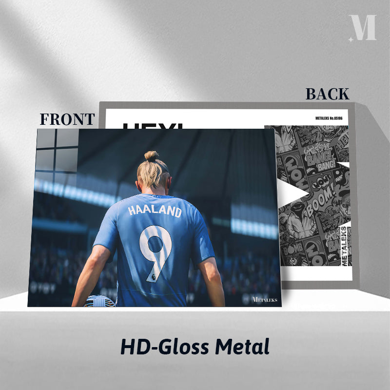 A person with blonde hair tied in a bun is wearing a blue soccer jersey with the name “HAALAND” and the number 9 on the back. Metaleks Ultra HD Metal Poster – Create Your Passionate Space.