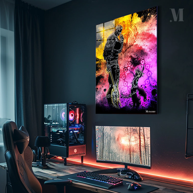 A muscular man holding a large axe stands next to a smaller, dynamic figure. Metaleks Ultra HD Metal Poster – Create Your Passionate Space.