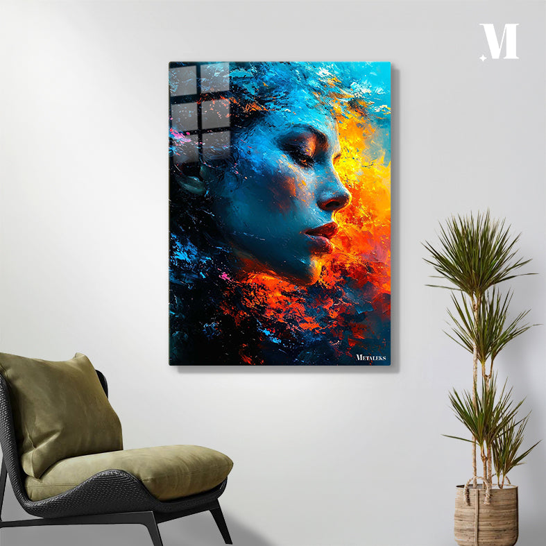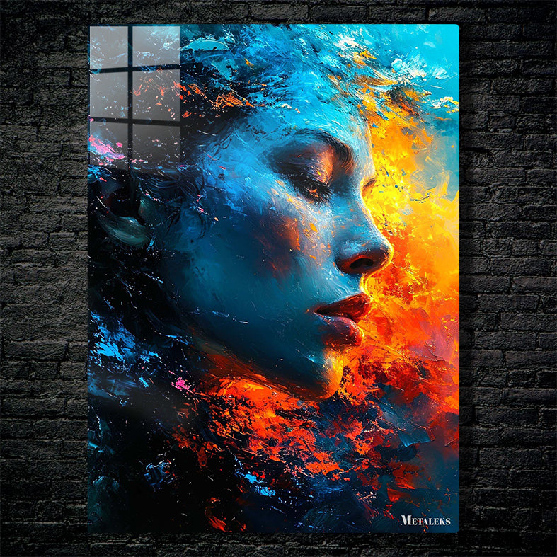 A woman with closed eyes, her face painted in blue and orange hues. Metaleks Ultra HD Metal Poster – Create Your Passionate Space.