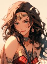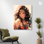 Wonder Woman, a character from DC Comics, has long curly hair, wears a golden tiara with a ‘W’ emblem, star-shaped earrings, a metallic choker, and a red and gold outfit. Metaleks Ultra HD Metal Poster – Create Your Passionate Space.