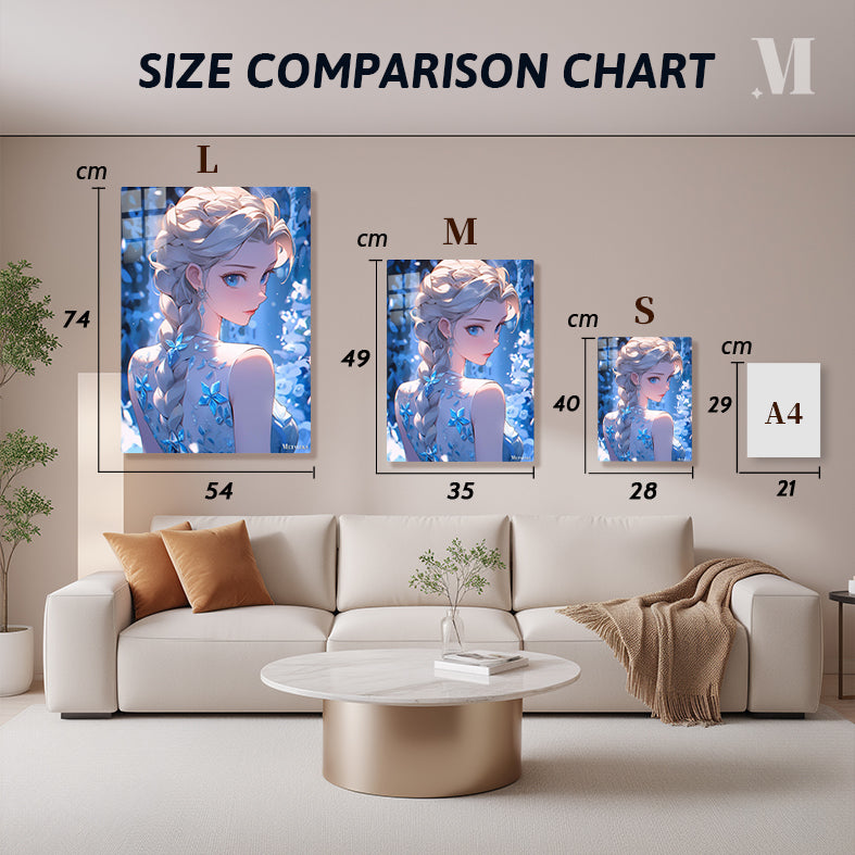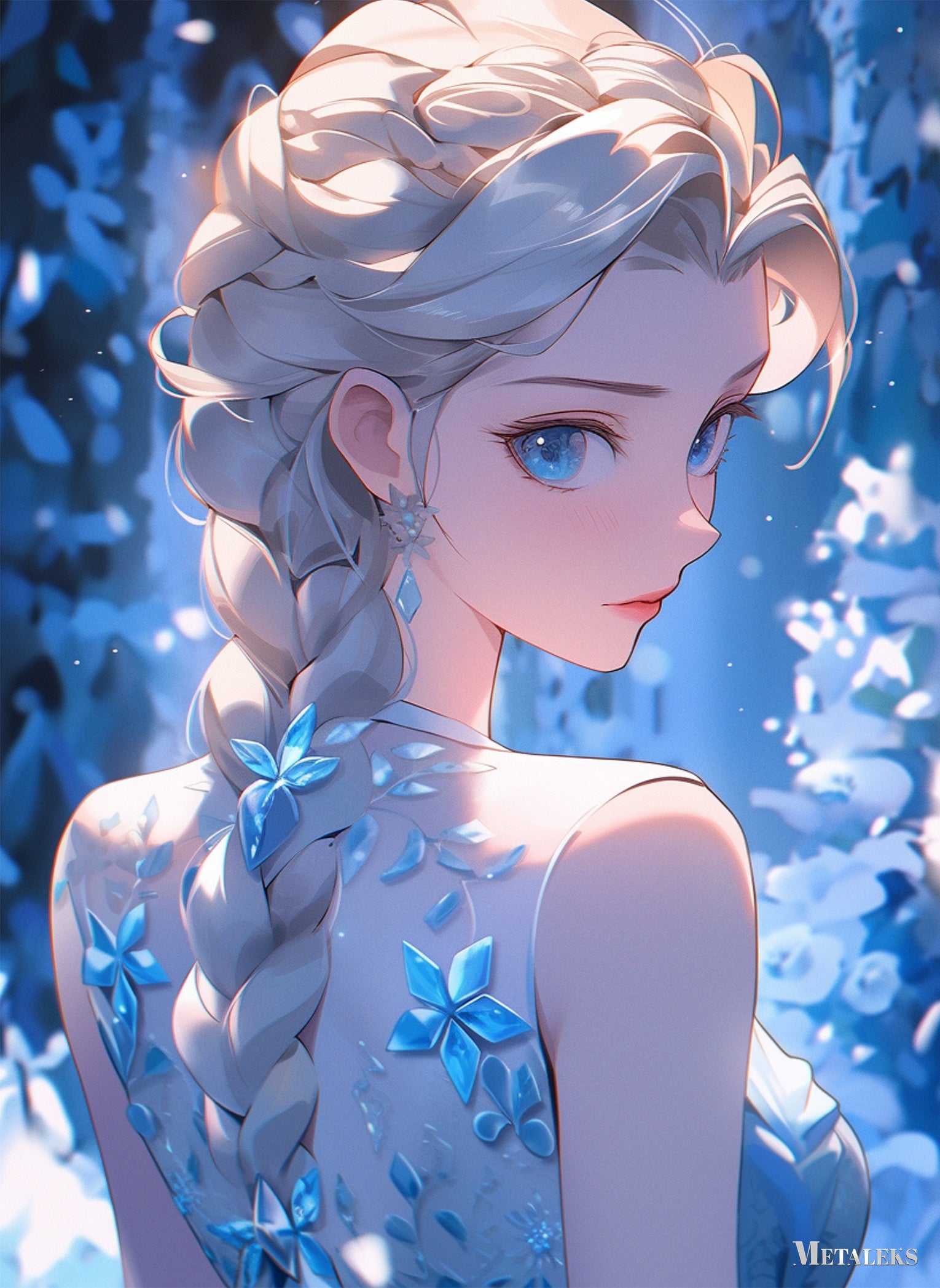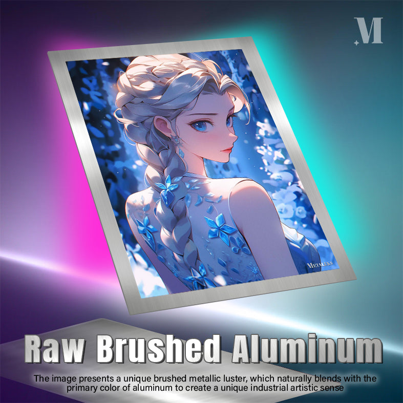 Elsa from “Frozen” has long, braided blonde hair. She wears a sleeveless dress adorned with blue floral patterns. Her large blue eyes and elegant appearance are highlighted. Metaleks Ultra HD Metal Poster – Create Your Passionate Space.