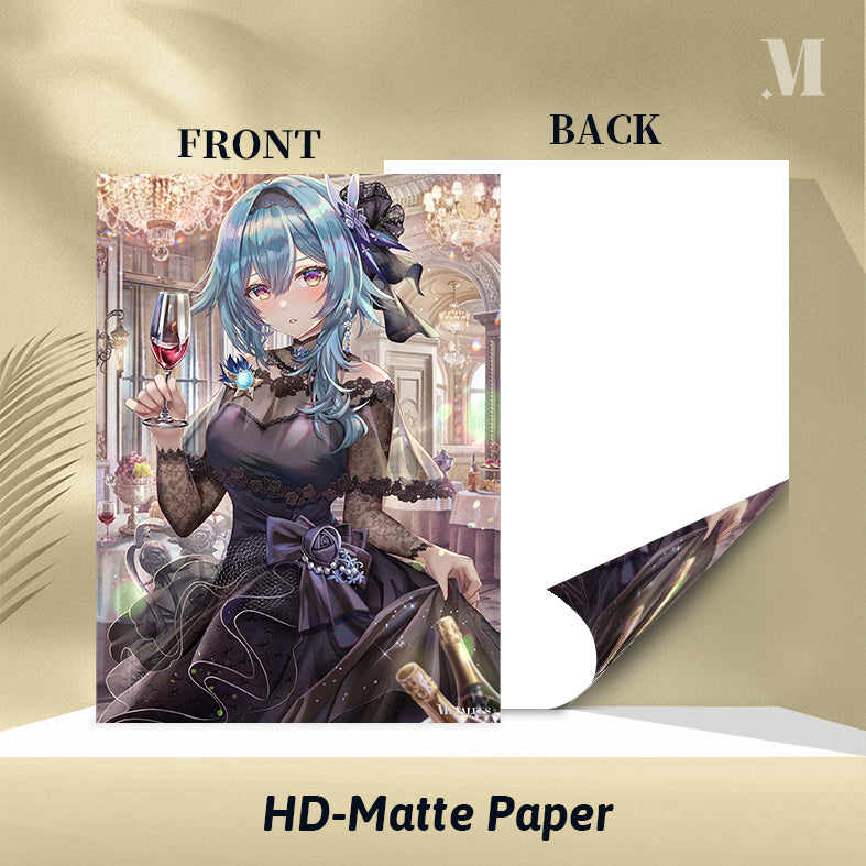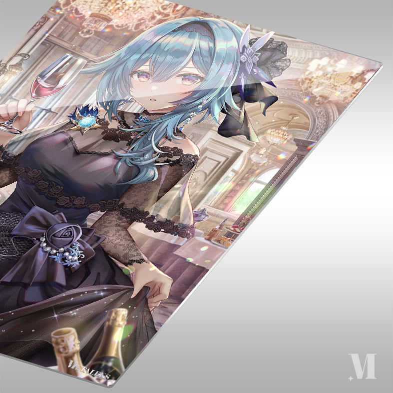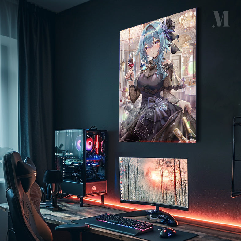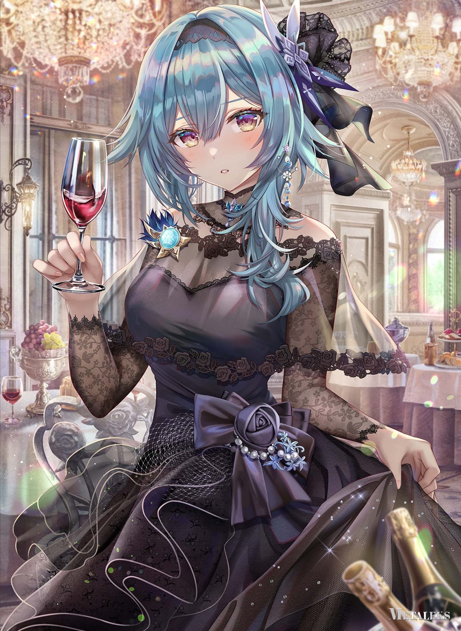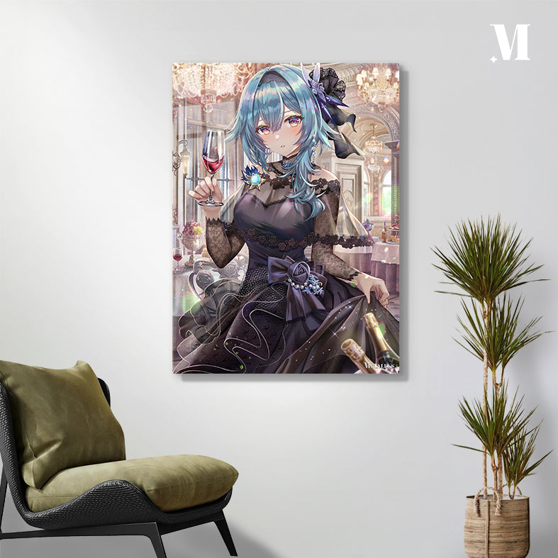 A character with blue hair, wearing a black lace dress with a large bow and holding a glass of red wine. Metaleks Ultra HD Metal Poster – Create Your Passionate Space.