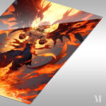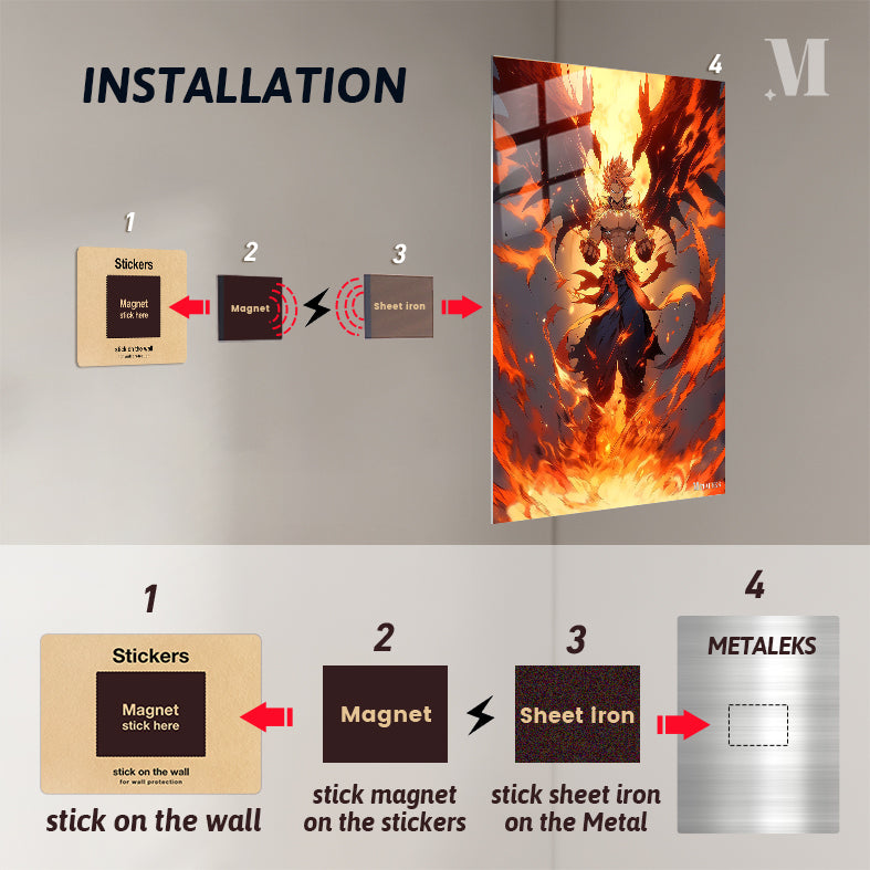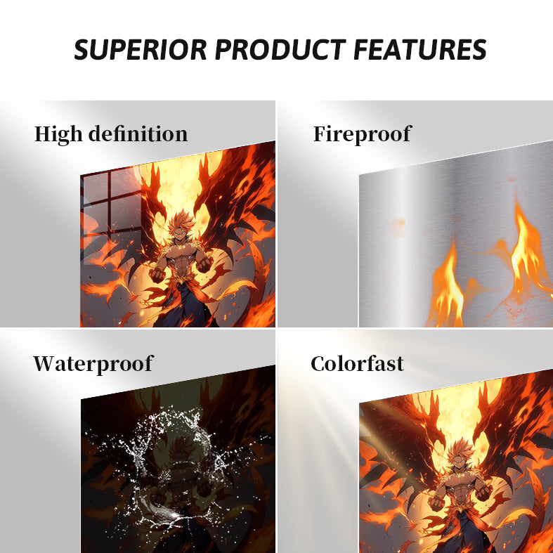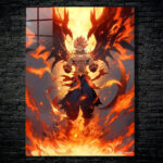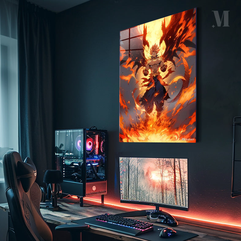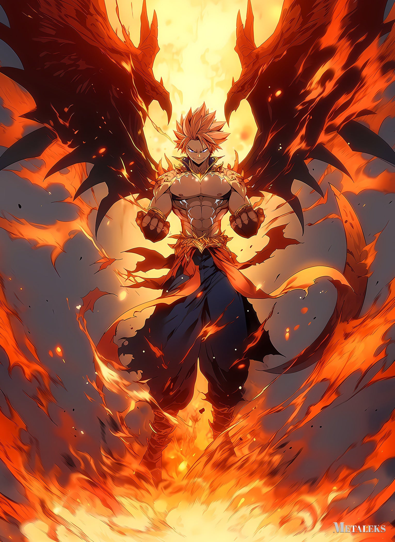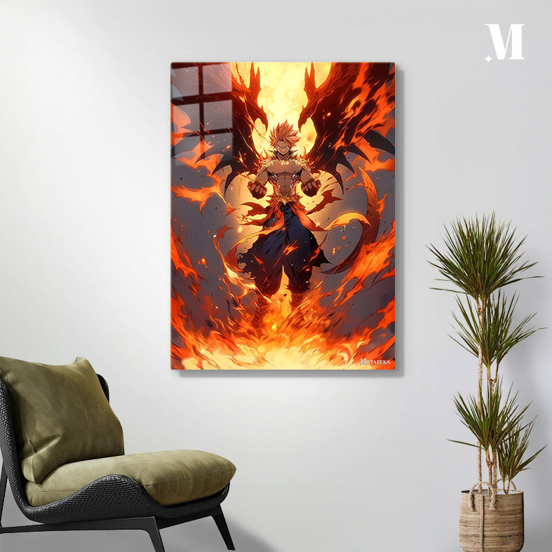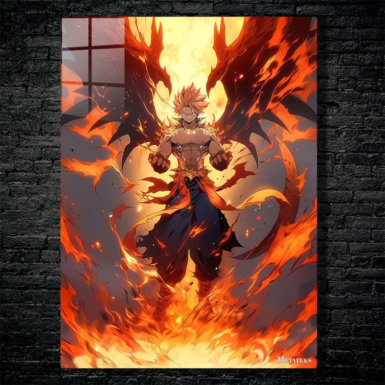 Natsu Dragneel from Fairy Tail stands with his fists clenched, surrounded by flames and dragon-like wings. Metaleks Ultra HD Metal Poster – Create Your Passionate Space.