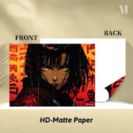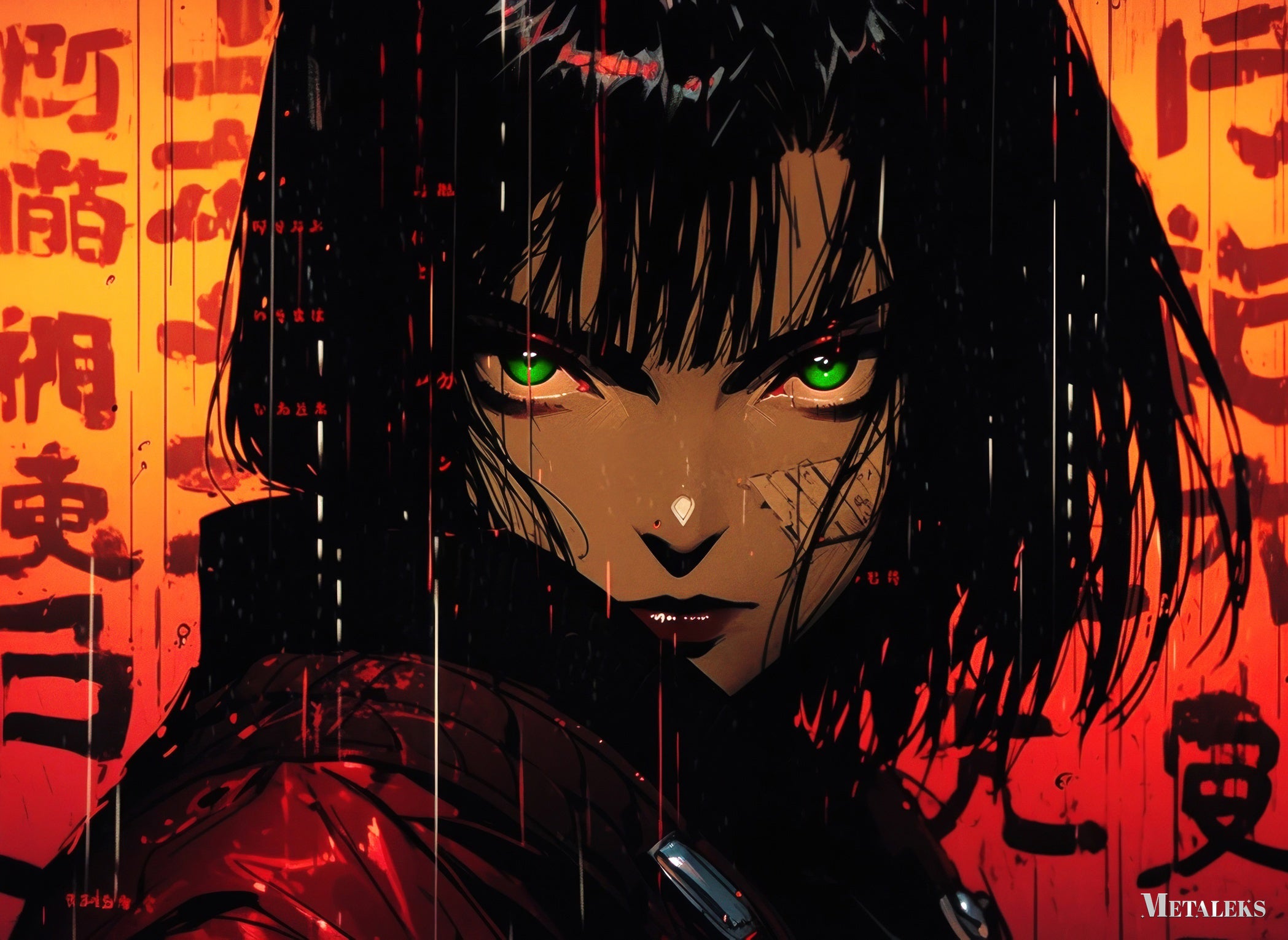 The image depicts Alita, a character from the movie “Alita: Battle Angel.” She has green eyes, short black hair, and is wearing a red outfit. Metaleks Ultra HD Metal Poster – Create Your Passionate Space.
