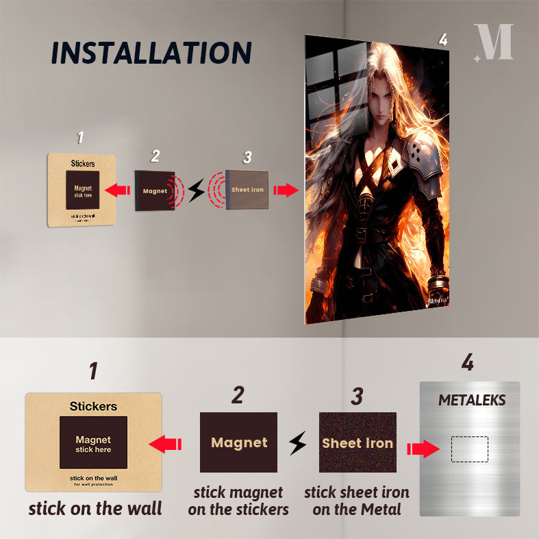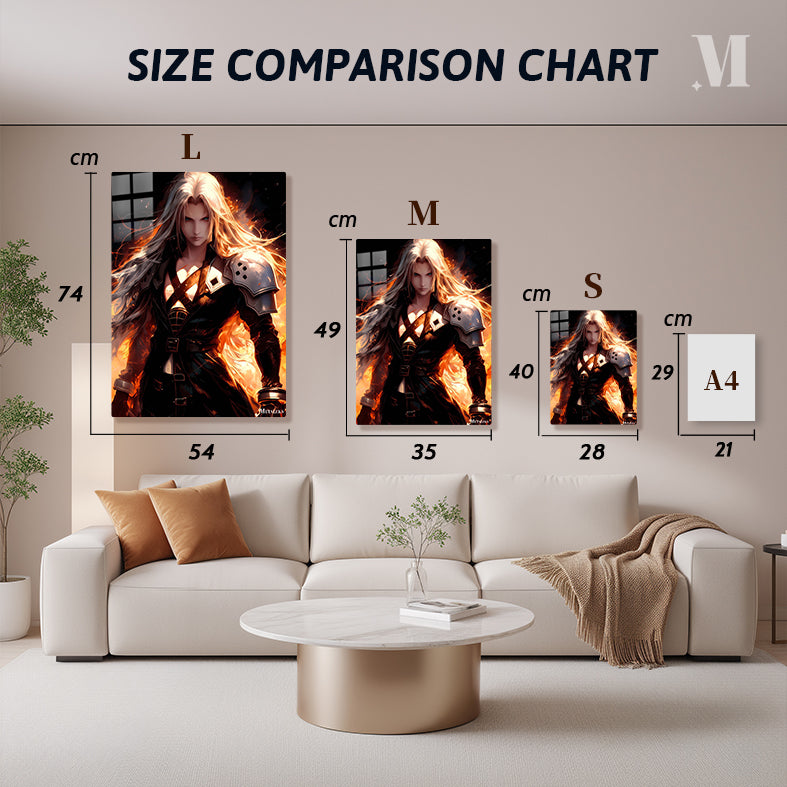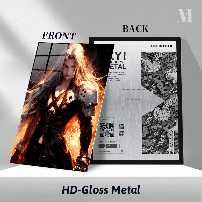 Sephiroth, a character from Final Fantasy VII, has long, flowing silver hair and is dressed in a dark, armored outfit. Metaleks Ultra HD Metal Poster – Create Your Passionate Space.