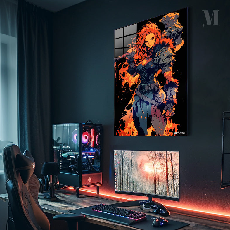 A warrior with long, flowing orange hair and a fierce expression, dressed in dark armor with fur trim, holds a large, menacing axe. Metaleks Ultra HD Metal Poster – Create Your Passionate Space.